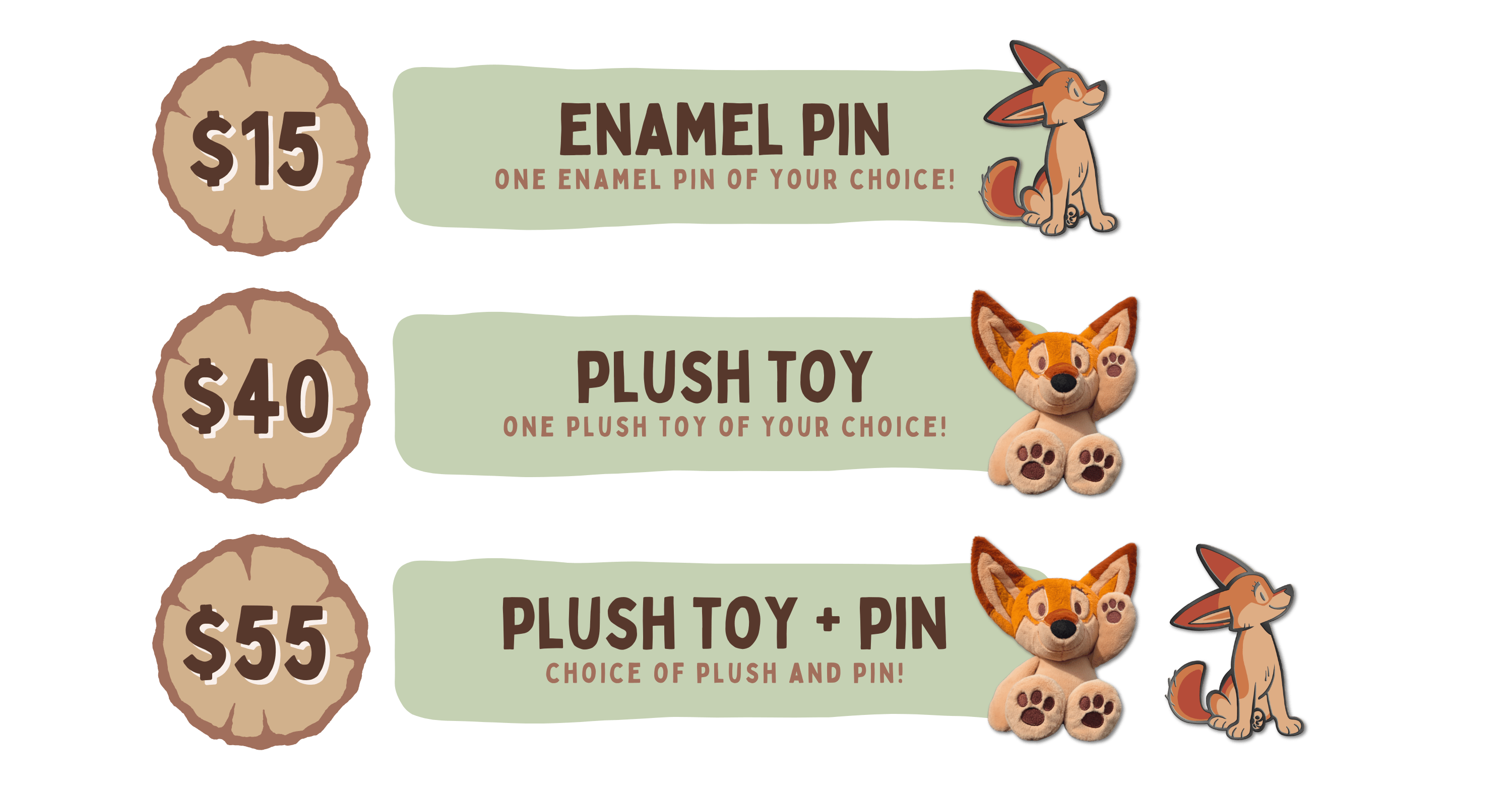 While the main star of the show are the plush toys, we have many tier options to suit everyone! From pins to stickers, we hope that we can offer a variety of options for all fans and collectors.