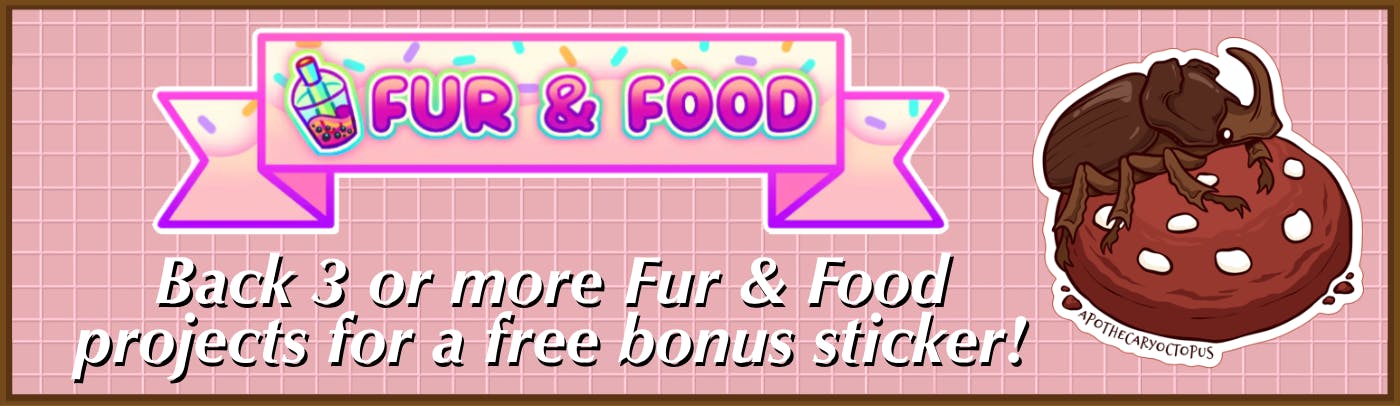 Banner Supporters: Pledge to 3 or more projects in the Fur & Food and get a FREE Red Velvet Cookie Beetle! We've all decided on a cookie theme for our freebie stickers, so the more projects you back the more cookies you collect! Freebie stickers will be sent with your pledge for each project- but you need to back at least 3 projects to qualify.
