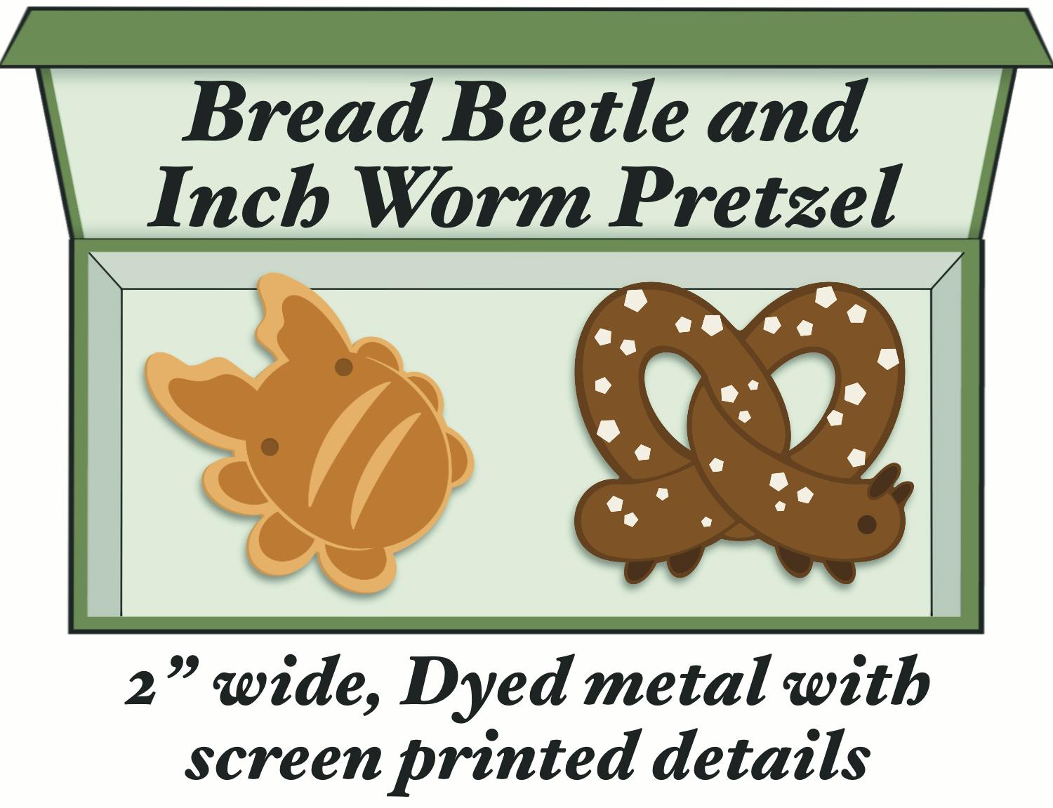 The initial funding goal of just $800 will unlock two pins, the Beetle Bread pin and the Inch Worm Pretzel Pin! These pins will both be 2" wide and made using dyed metal, soft enamel, and a screen print for the fine details. This is a new style of pins for me, but I can't wait to try these designs!