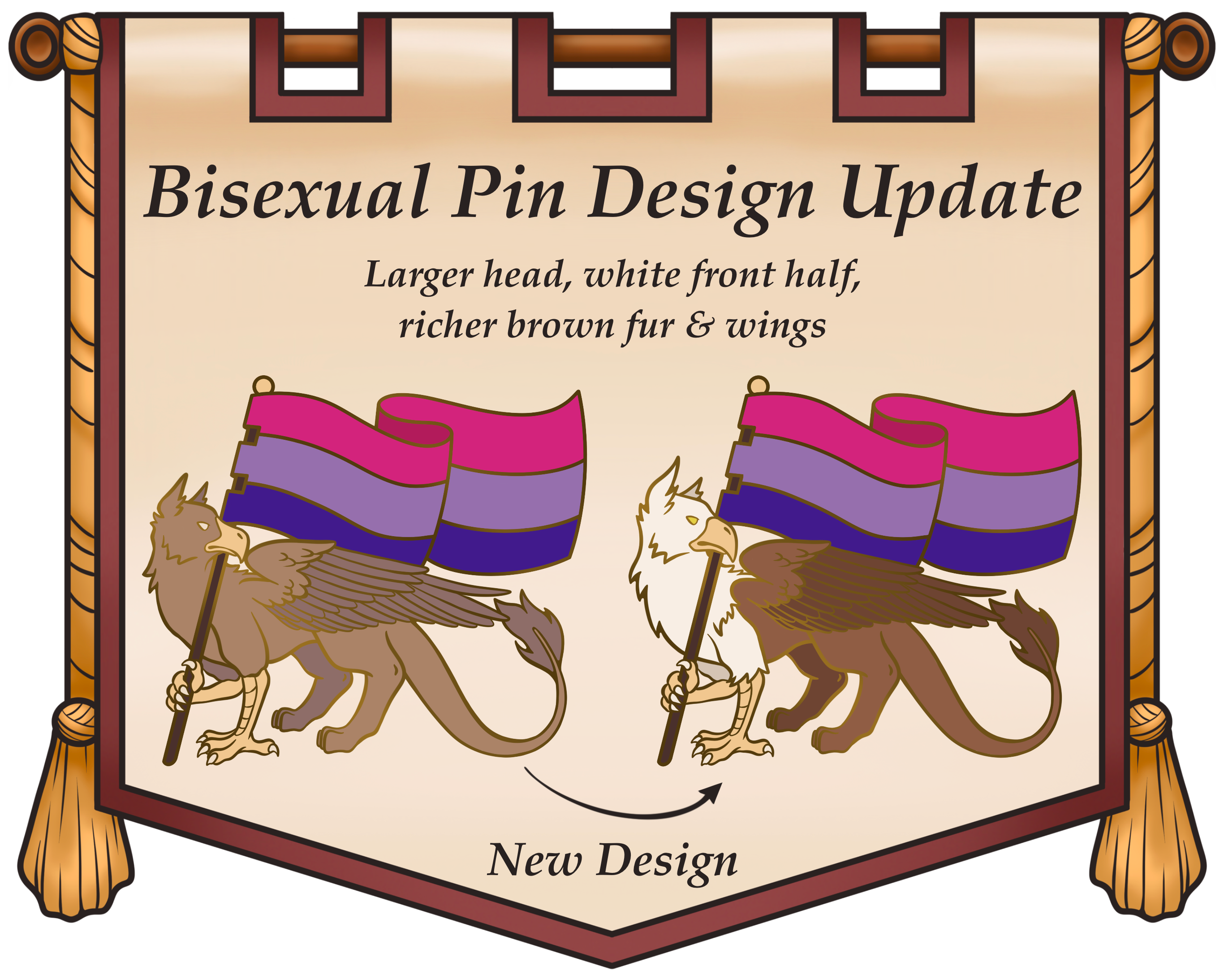 Design Changes: Update on the Bisexual Gryphon design! This one has been bugging me recently, so I tried a more traditional gryphon design and I like it a lot more! The new version has a larger head with white feathers, and a richer, darker brown for the fur on the back half.
