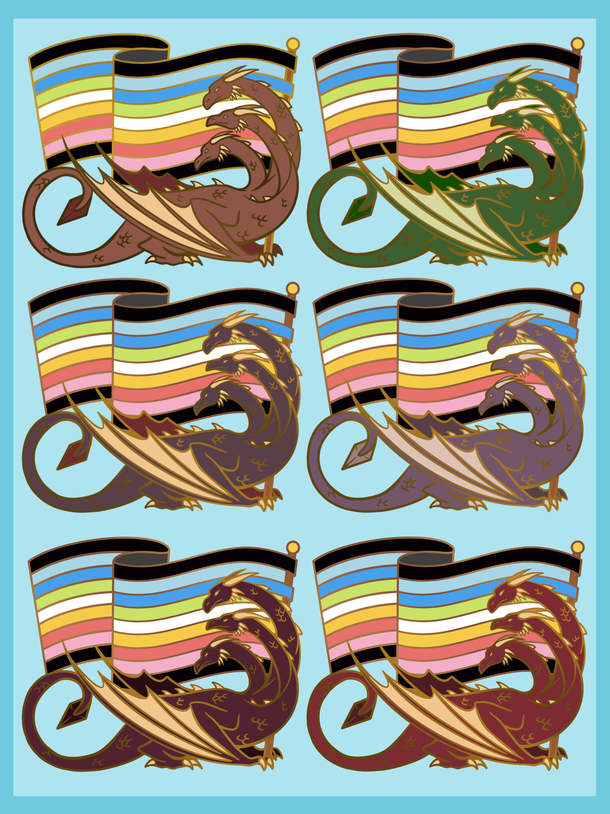 Up now: vote for the AroAce flag! For these creatrures I chose several that are combinations of different animals, since AroAce is a combination of both Aromantic and Asexual. You'll be able to choose between the Chimera (a creature with the heads of both a lion and goat, and a snake tail), a Basilik (front half of a rooster, with the tail of a snake), and a Kirin (a dragon/ horse creature with scales and a horn). Voting for this pin is available now!