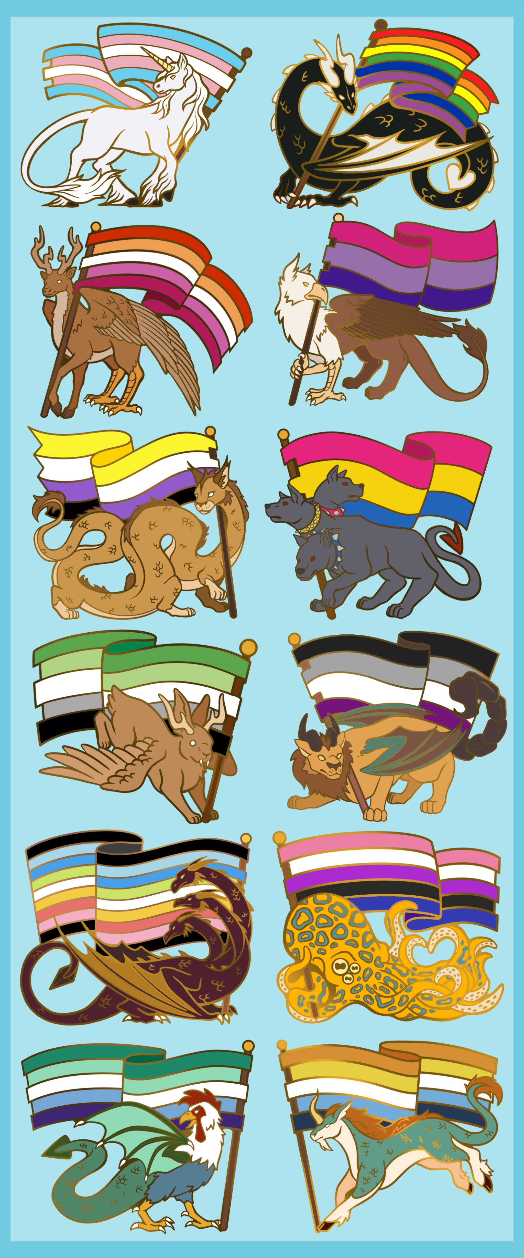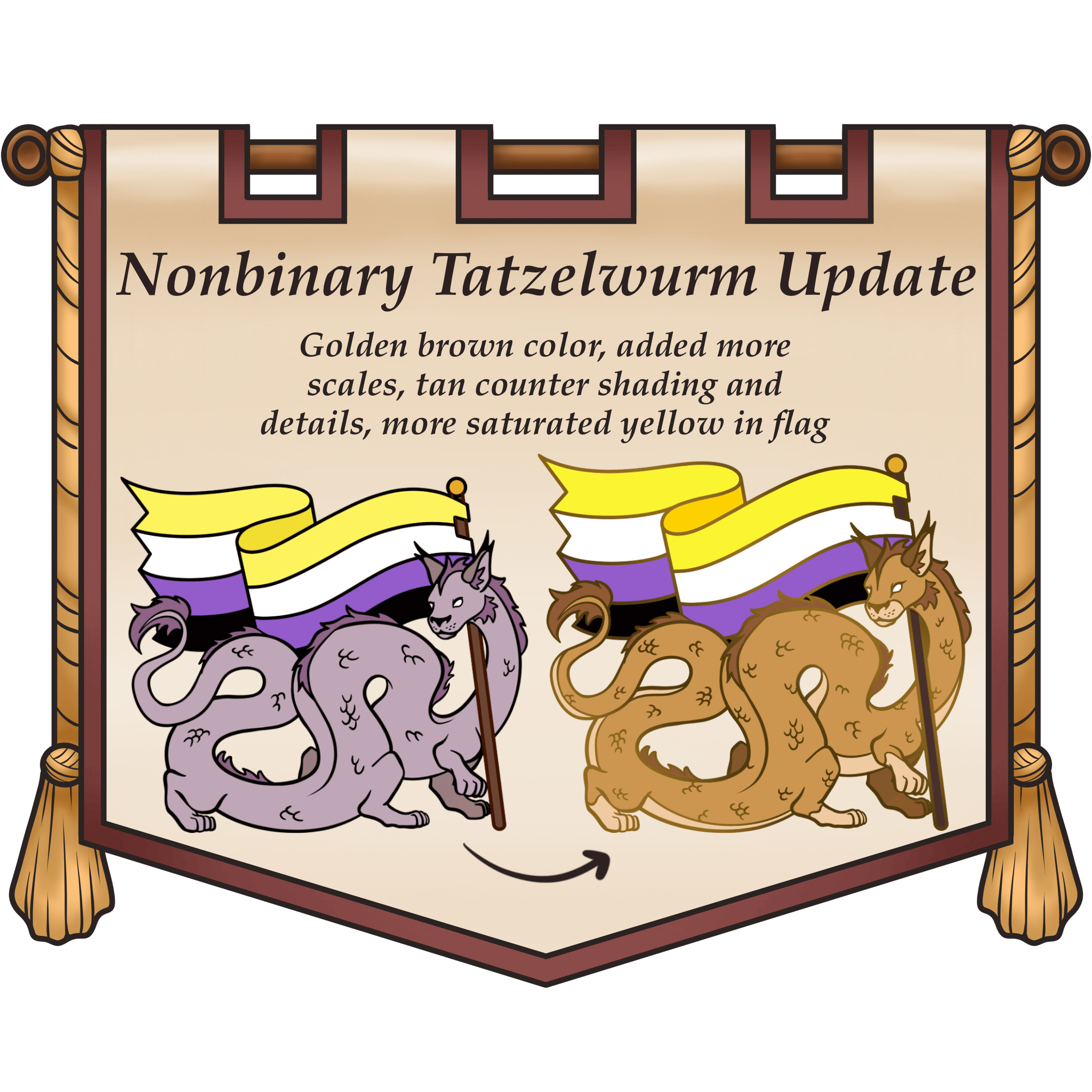 Next up- Design Changes! I have two design updates for you- one for the Queer Hydra and one for the Nonbinary Tatzelwurm. This design has changed the most from what was shown in the campaign, but I think it looks much better now! I added more scales, gave the whole beast a more warm brown fur-like color, made the paws, muzzle, and belly a light tan, and made the eyes white so they would pop more against the beige. I also made the yellow of the flag a bit more saturated and adjusted the lineart in a couple places, though these aren't as noticeable. The design looks a lot more like a blend of the Wampus cat from Native American culture mixed with the original Tatzelwurm snake/cat hybrid, and I love it!