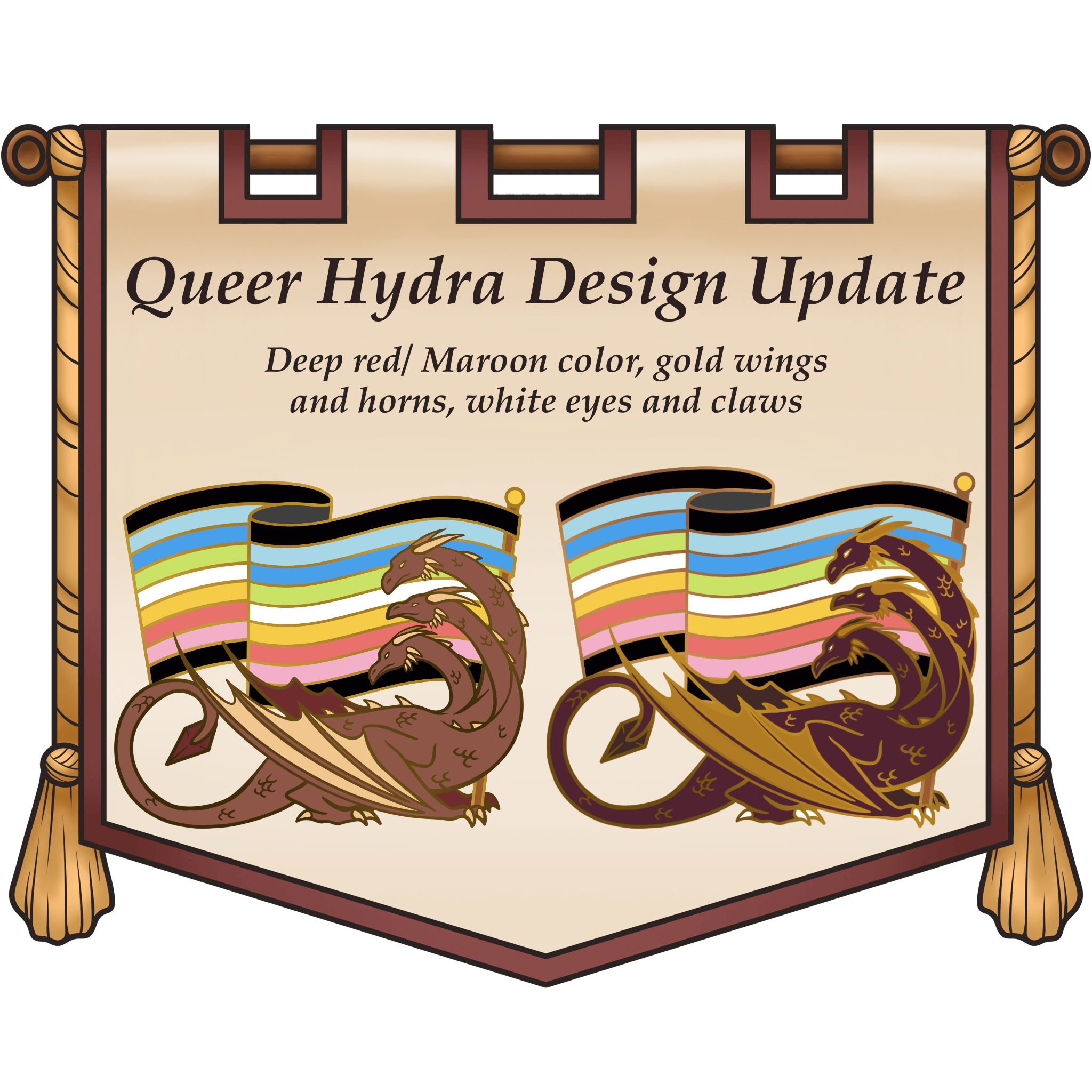 Next! The Queer Hydra got a bit of a facelift too- The Maroon color variant won the poll from last week, so here is the final version. I went with the gorgeous deep red color for the body and complimented it with a deep yellow/ gold for the wings, horns, and spike accents, as well as made the claws and eyes bright white so they pop against the dark scale of the dragon.