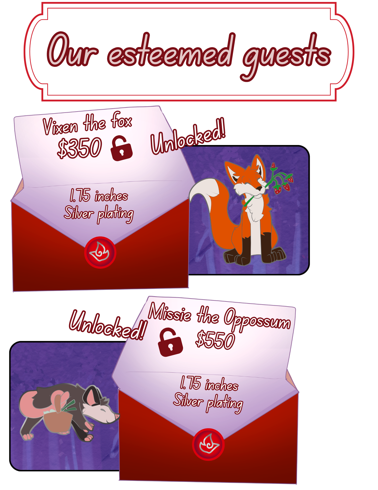 Vixen the Fox- Unlocks at 350 - Missie the Opossum-Unlocks at 550 Jane the Deer- Unlocks at 750 Bandit the Raccoon- Unlocks at 950 All the guest are