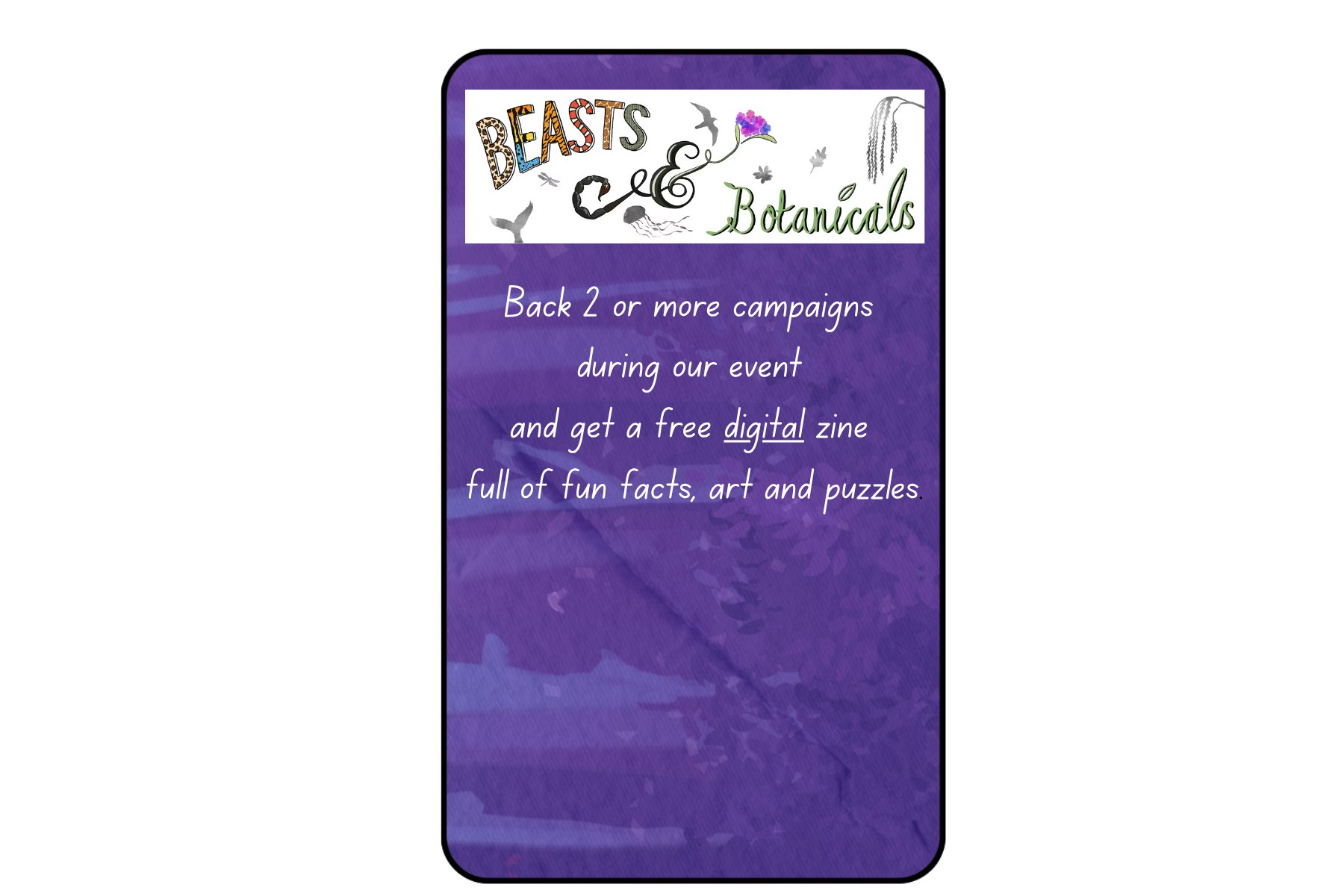 Back 2 or more campaigns during the event and get a free digital zine full of fun facts, art and puzzles. Featuring contributions from every campaign taking part in Beasts & Botanicals. (Excludes tip jar only pledges)