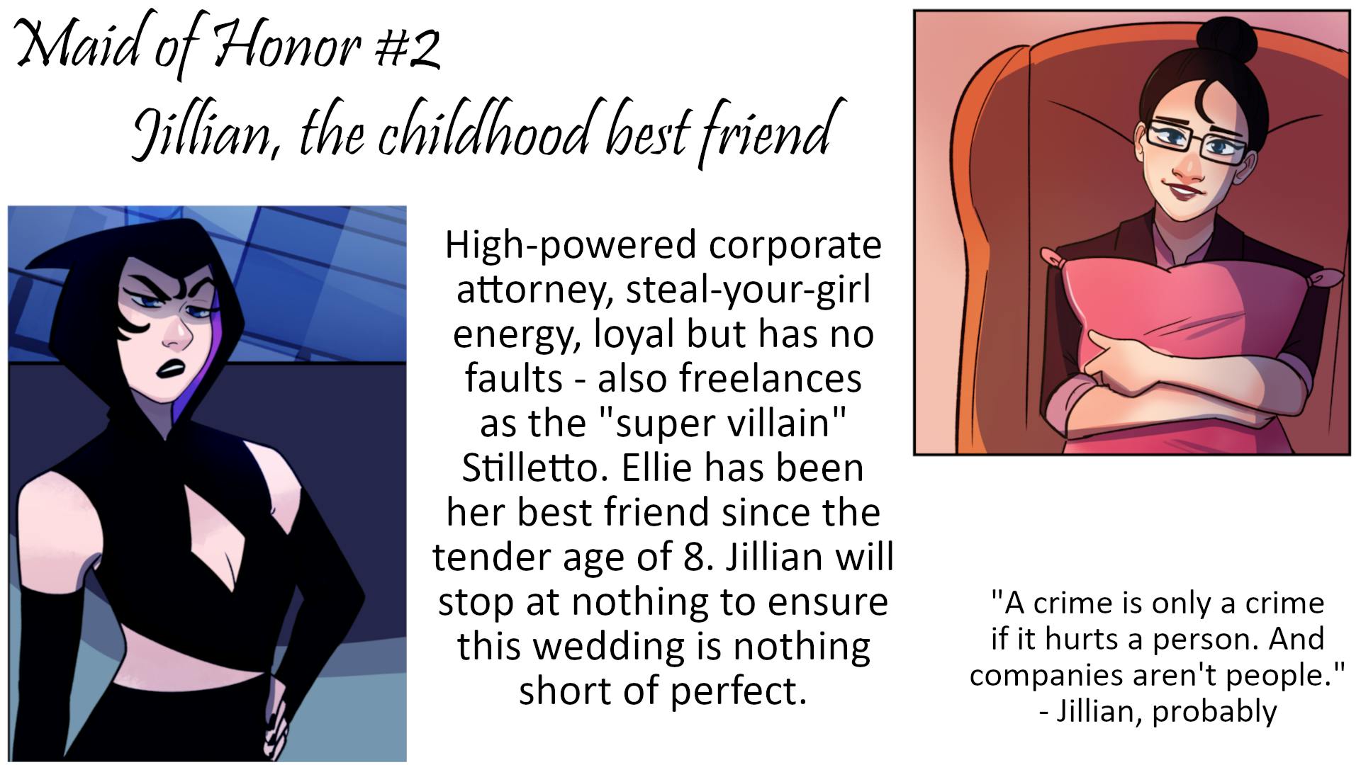 The sweetest, nicest lady in the world is getting married, and she asks her two best friends to be her co-maids of honor. Said best friends are actually superhero/villain archnemeses. Shenanigans ensue.