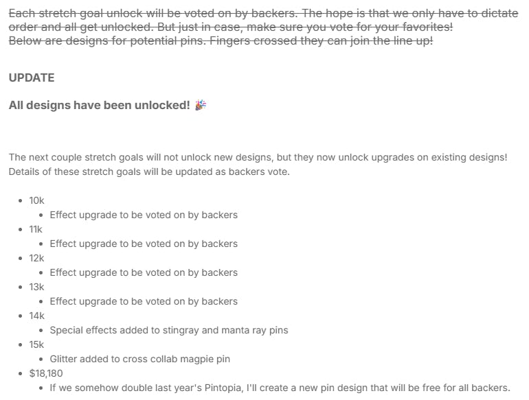 Thank you for your continued support! There's still plenty of time to reach these goals, so please consider sharing the campaign with others. I was almost able to gift free pins last Pintopia, but we fell a little short. We're on track to do it this year, so let's keep the momentum going!