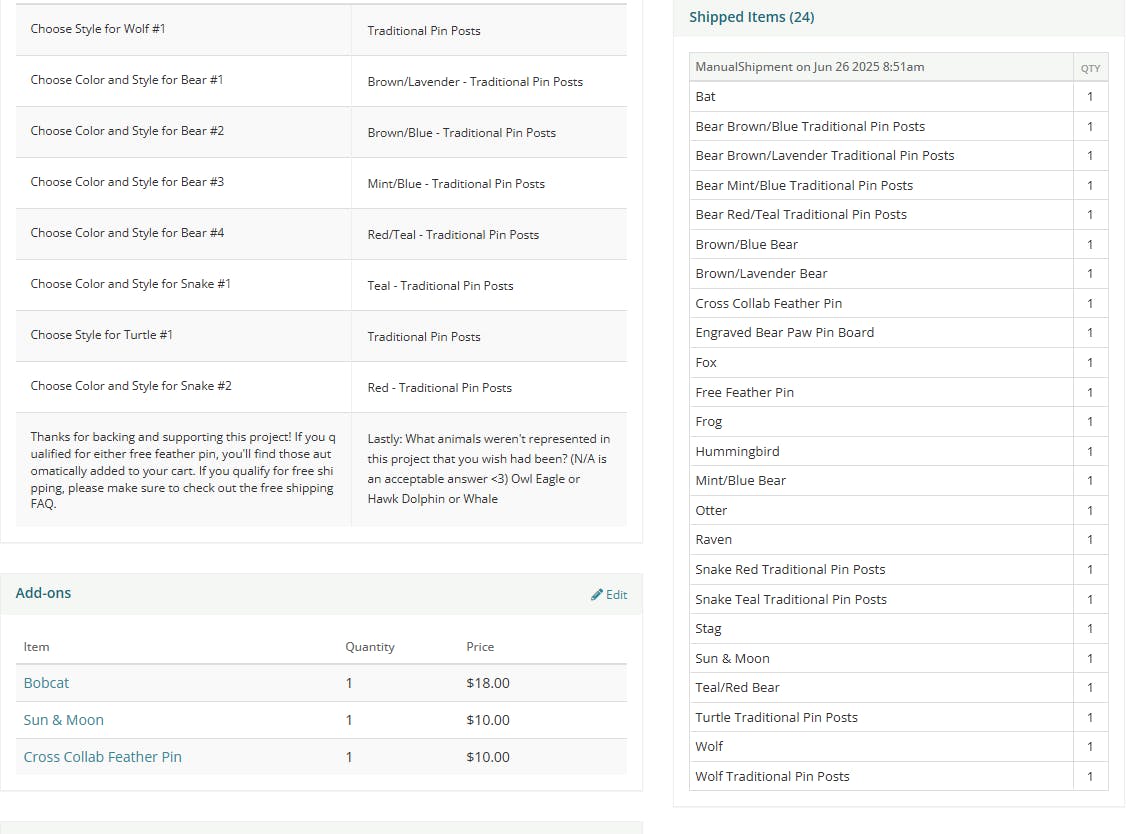 Oh jeez. I've gotten a couple messages from folks about missing items. I'm so, so sorry. Looking back at the pledge manager, it looks like BackerKit had some weird exporting issues. Below is a screen cap from one backer's order. We can see the bobcat added on the left side. On the right side where it says "shipped items," the bobcat is not listed. The list on the right side is the packing list that BackerKit generated and is what we print out to know what goes where.