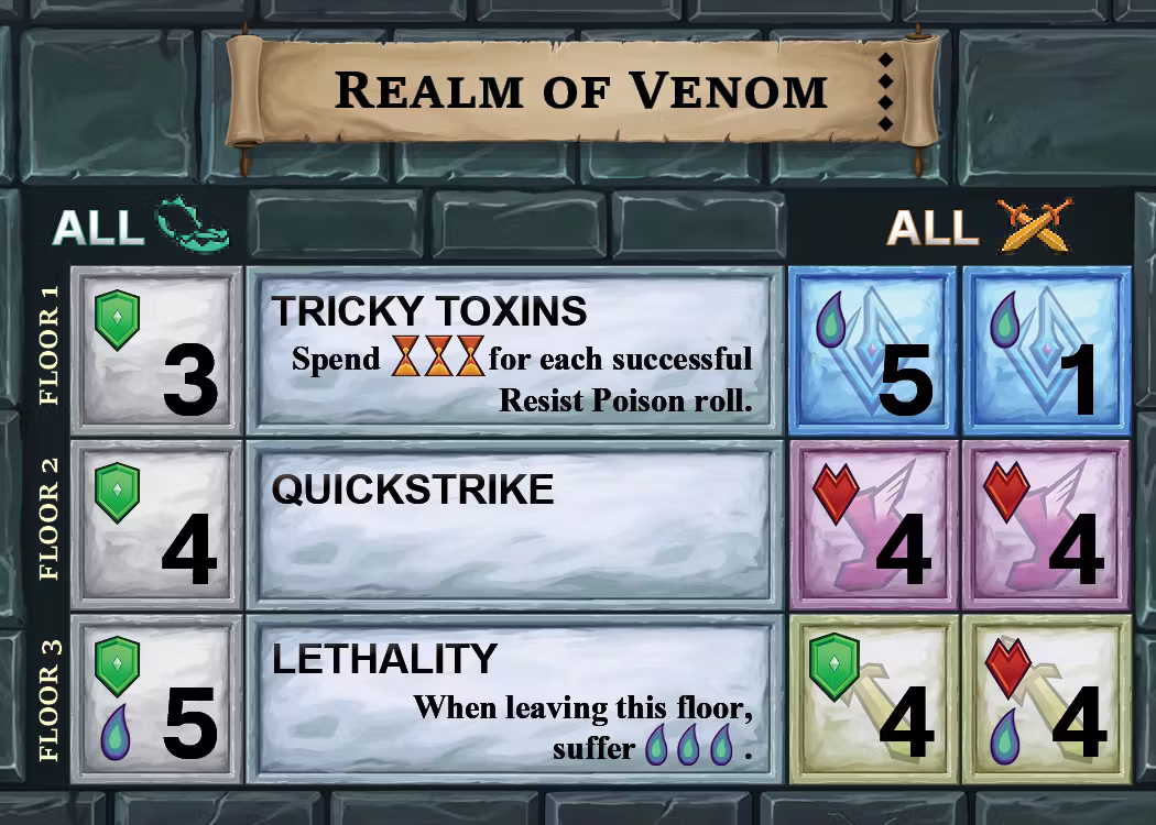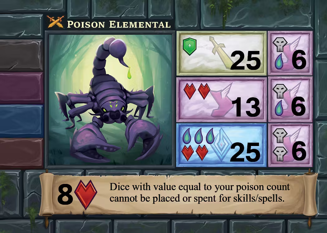Each alternate boss/dungeon places a new twist on their idea. The Poison Elemental now restricts dice during the boss fight instead of exiling poison tokens. They're hard! Good luck :)