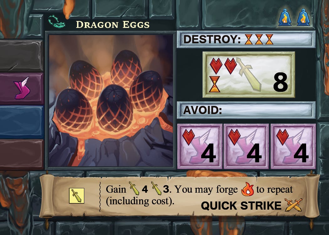Quick Strike is a relatively simple skill, exchange a yellow die for two better dice. But now you can feed a fuel into it to do it twice - even potentially using the gained 3 to pay for it! The drawback is that one fuel's added to the forge, bringing it one step closer to a Flare.