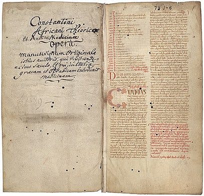 But then, the twist: A “complete” version of Liber pantegni, with all twenty books of Theorica and Practica together, began to circulate long after Constantine’s death. Green wrote, “Exasperatingly, we still can’t pinpoint when and where this last, unknown editor was working. No extant copies of the ‘re-created’ Pantegni Practica have been found that date before the second quarter of the thirteenth century,” which dovetails quite nicely with the canonical year of 1220 for Ars Magica. So...enter the fantasy fiction!