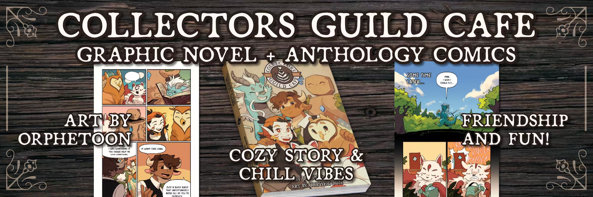 The Collectors Guild Cafe is a cozy, LGBTQ-Friendly graphic novel about five friends who come together for adventure and fun playing D&D in their friend's cafe! They are Alister the Minotaur, Hatch the Griffin, Mythri the Siren, Titus the Golem, and Zephyr the Dragon.