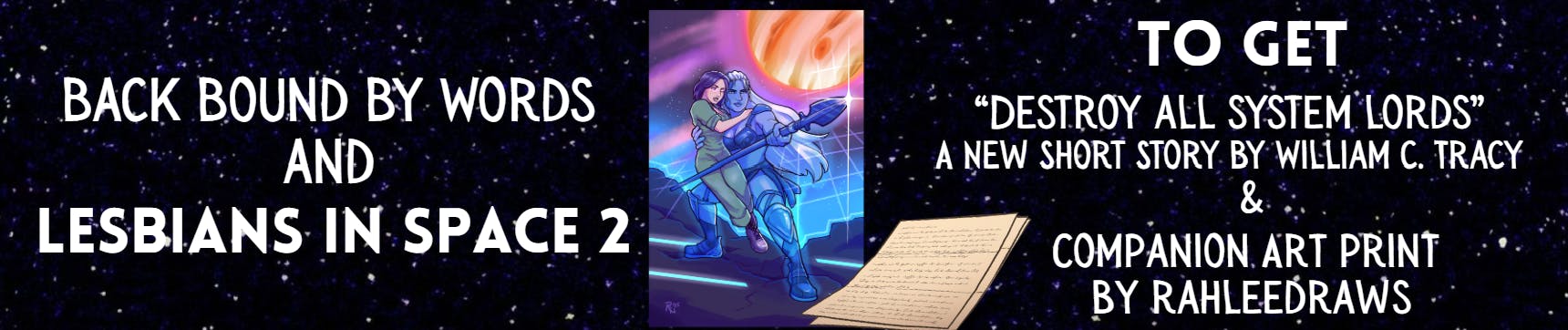 When you back Lesbians In Space 2 and Bound By Words, you'll get an exclusive short story "Destroy All System Lords" by William C. Tracey with the companion art print by Rahlee Draws. It's an epic and thrilling sci-fi story that may be short but packs a punch.