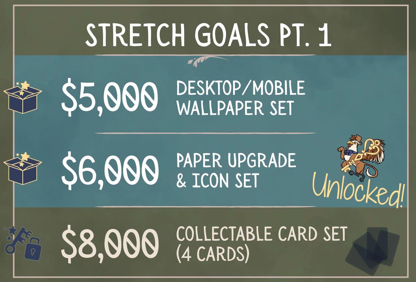 We're closing in on the end of the campaign with only eight days remaining! We've unlocked a paper upgrade for every book, and we're well on our way to unlocking collectable cards as well. These cards will have some fun notes about each of the characters, and we'll be sending out digital versions of them, too.