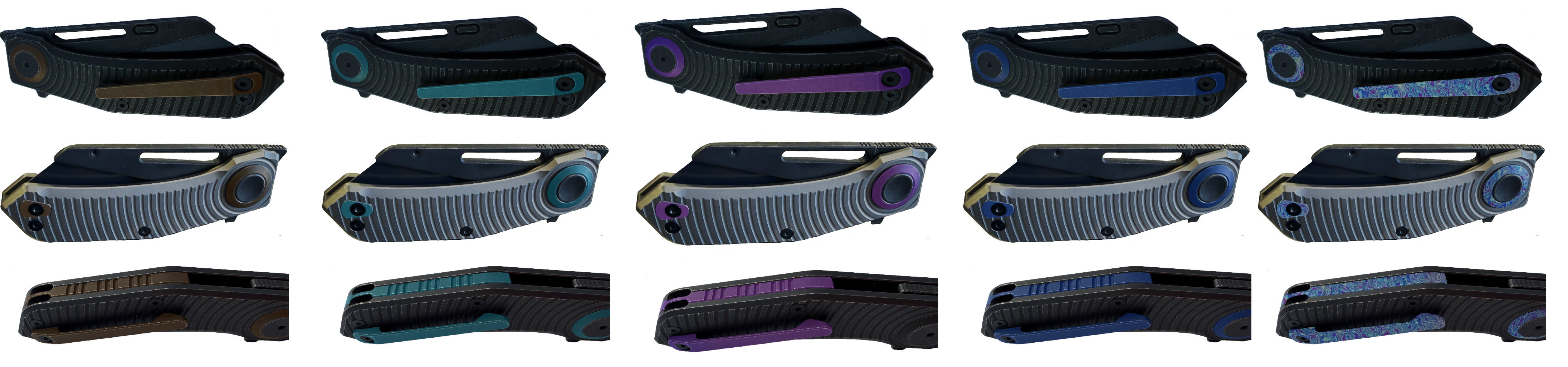 $47,500 - Anodized Titanium and Timascus Accents If we hit $47,500, we'll be able to offer accent kits for Snarf. These would be for sale as add-ons and we could offer satin and stonewashed finishes for blue, purple, rust, and teal accents. We can also offer timascus accents. We've mocked these up so you can see what they'd look like: