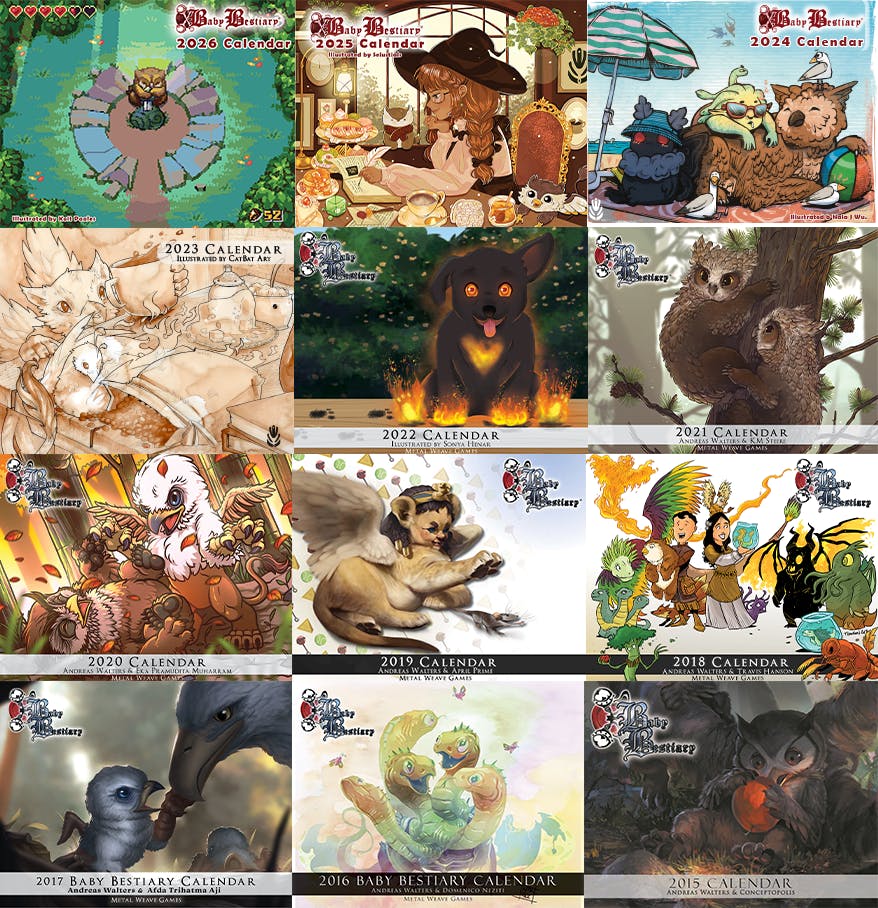 Each year we sponsor a different artist to illustrate our annual Baby Bestiary calendar. This calendar is dedicated to showing off our favorite tabletop creatures in their cutest form.