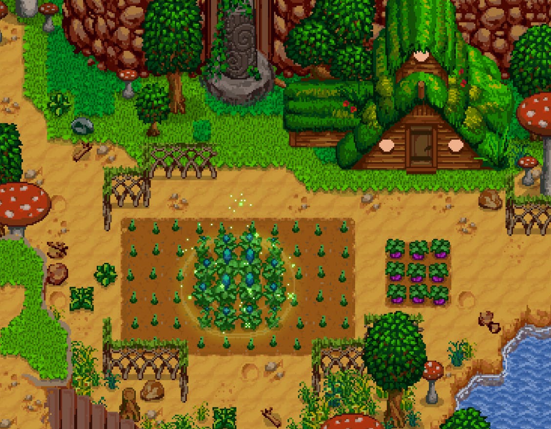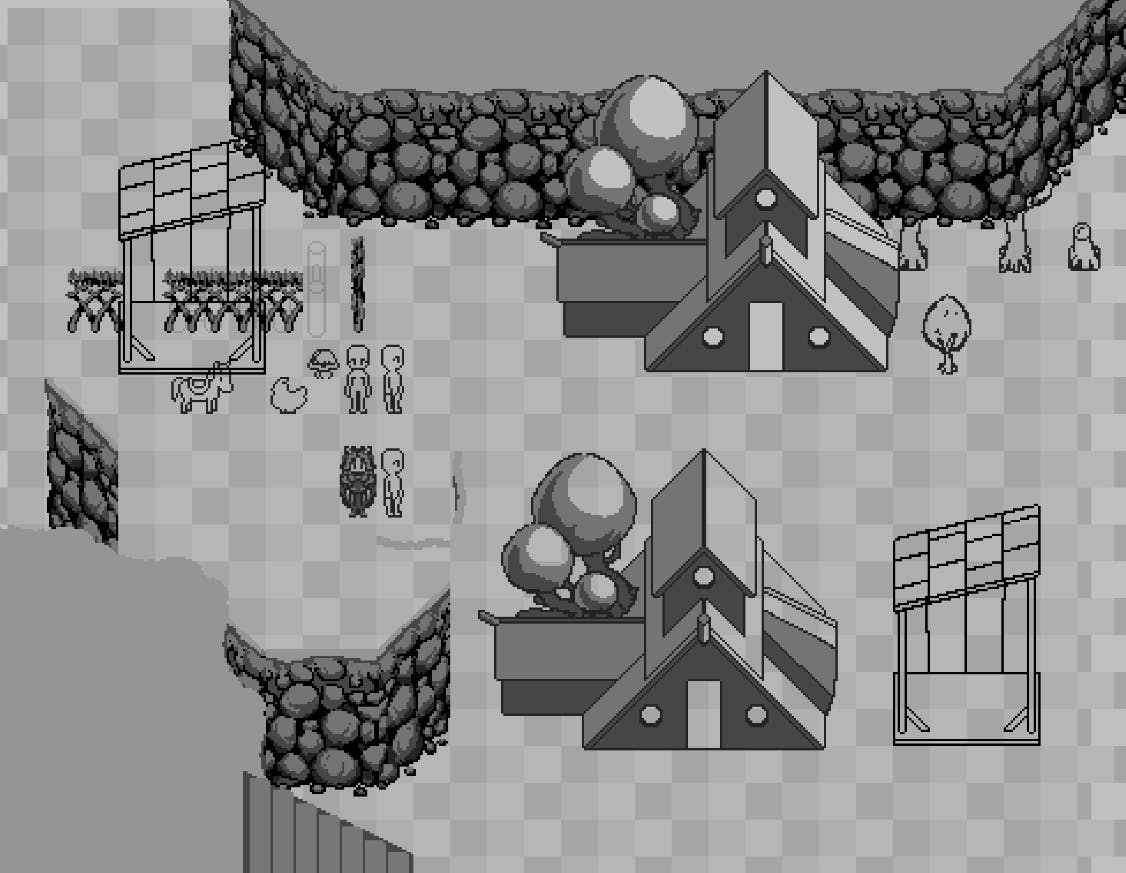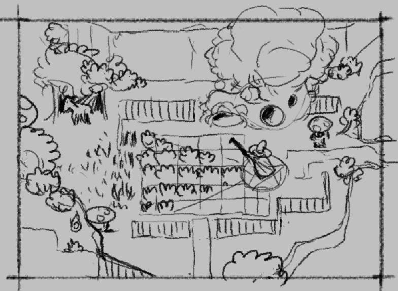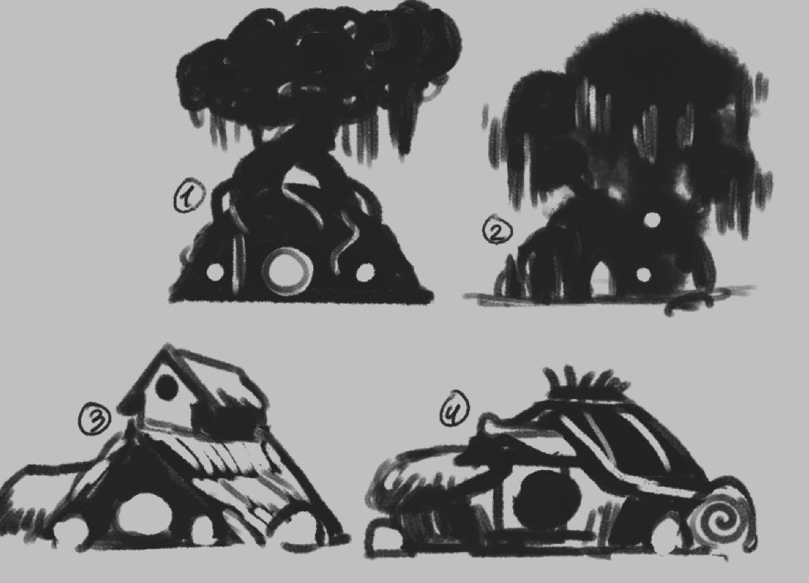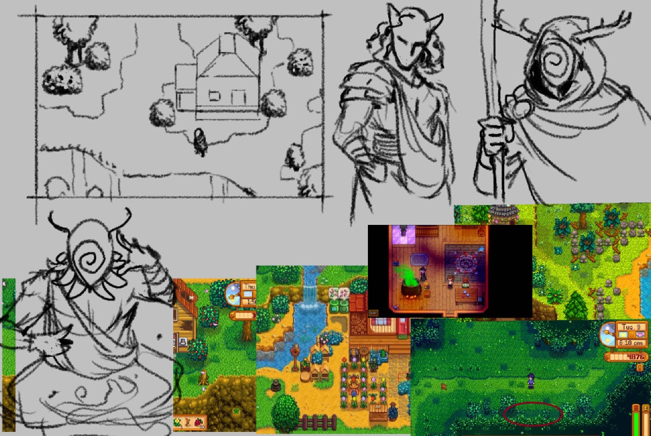 We start out with our reference art, and some sketchup styles Another concept art idea Concept ideas for druid-y homes hoenstly all of these were pretty cool, i felt like 3 was the most, 'house-y' that would give home vibes while not straying too far away from a recognizable stardew aesthetic Druid concept art i picked the last one cause feather mantles are awesome. Blockouts to figure out scale/zoom even though the right is more true to resolution, the left is more readable (esp as a calendar image)