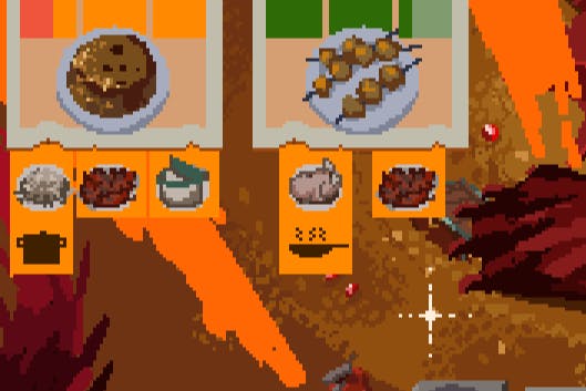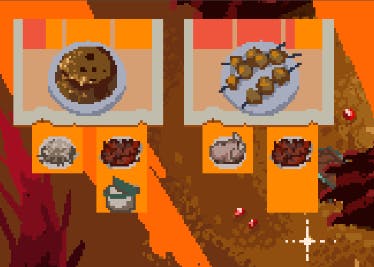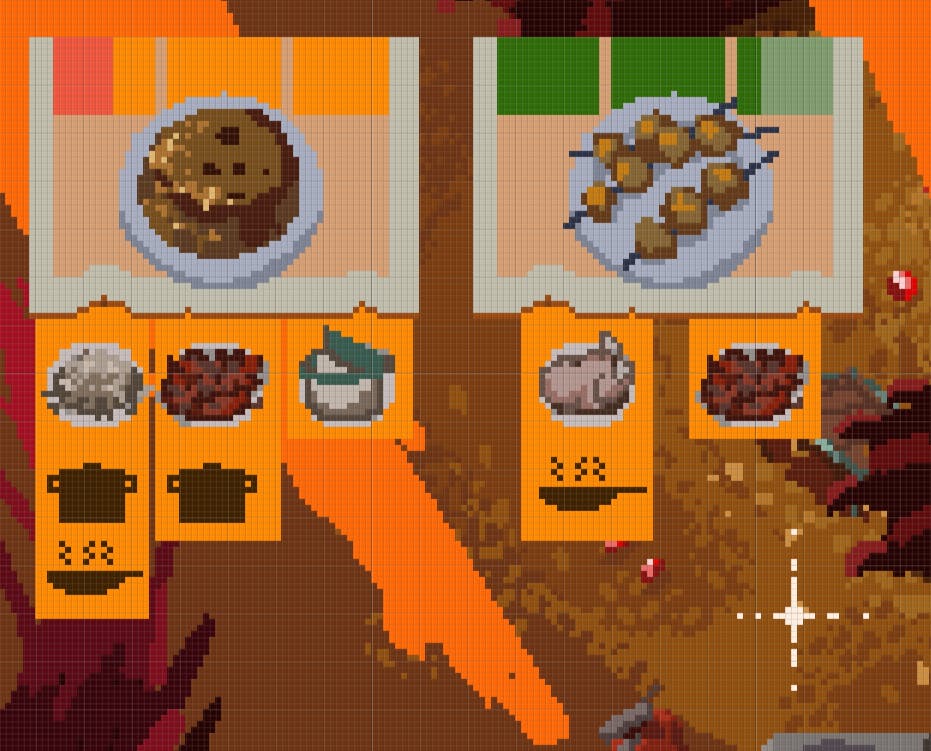 Translated detail pass UI, chefs, wyrmlings and more of the glowing effects Here we noticed that the stage was a little funny shaped and that we should take advantage of the whole area (no need to have two visual walls Also we talked quite a bit at what kind of food should the dragon be cooking. Should it be all meat? or something else? IDK why but i came across burnt rice recipies, and perfect timing, because that seems fitting for a dragon to enjoy burnt foods. So we ended up with Chicken Skewers and Tahdig (also known as scorched rice), which is typically cooked with saffron and served with yogurt.