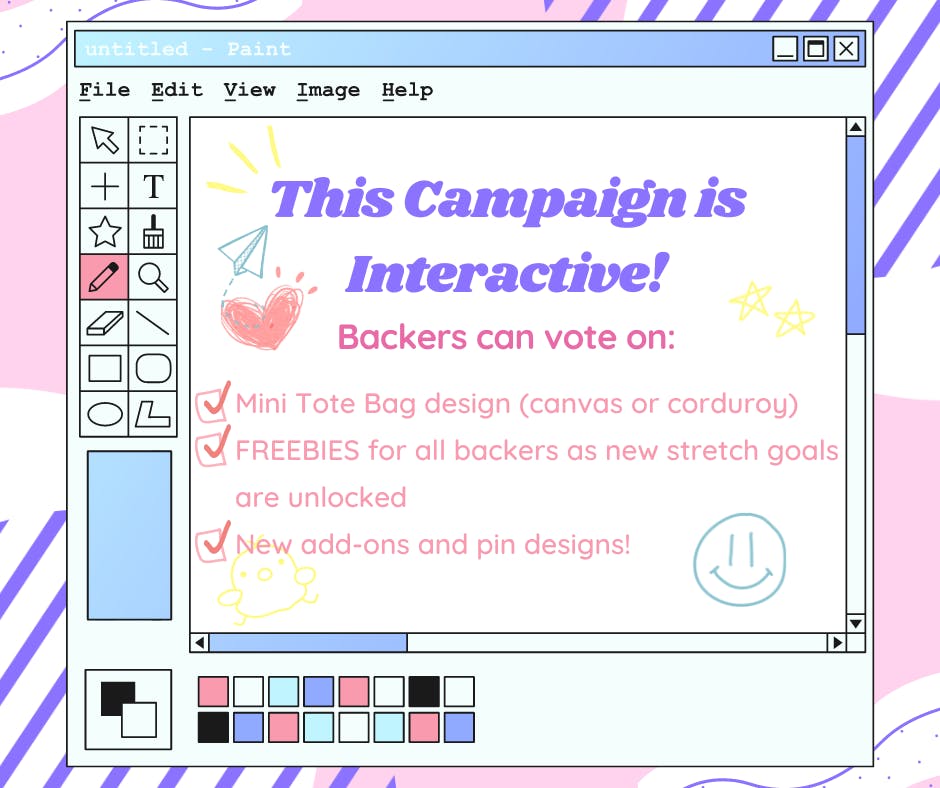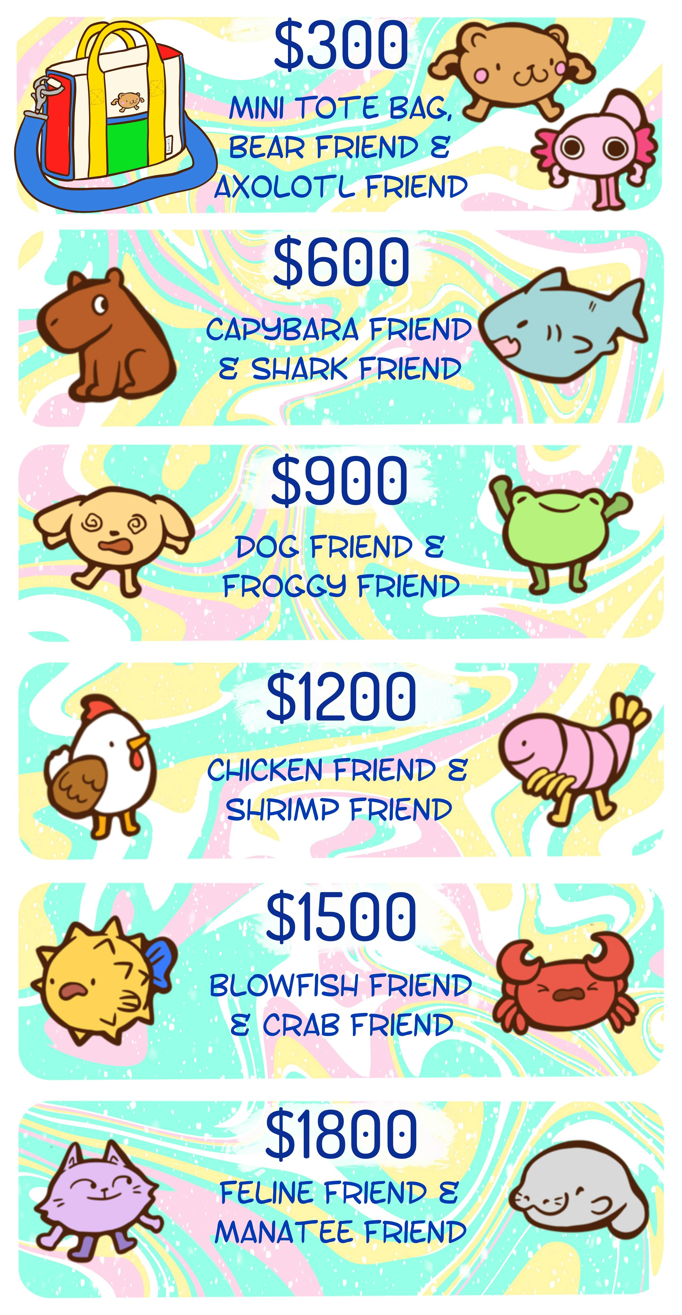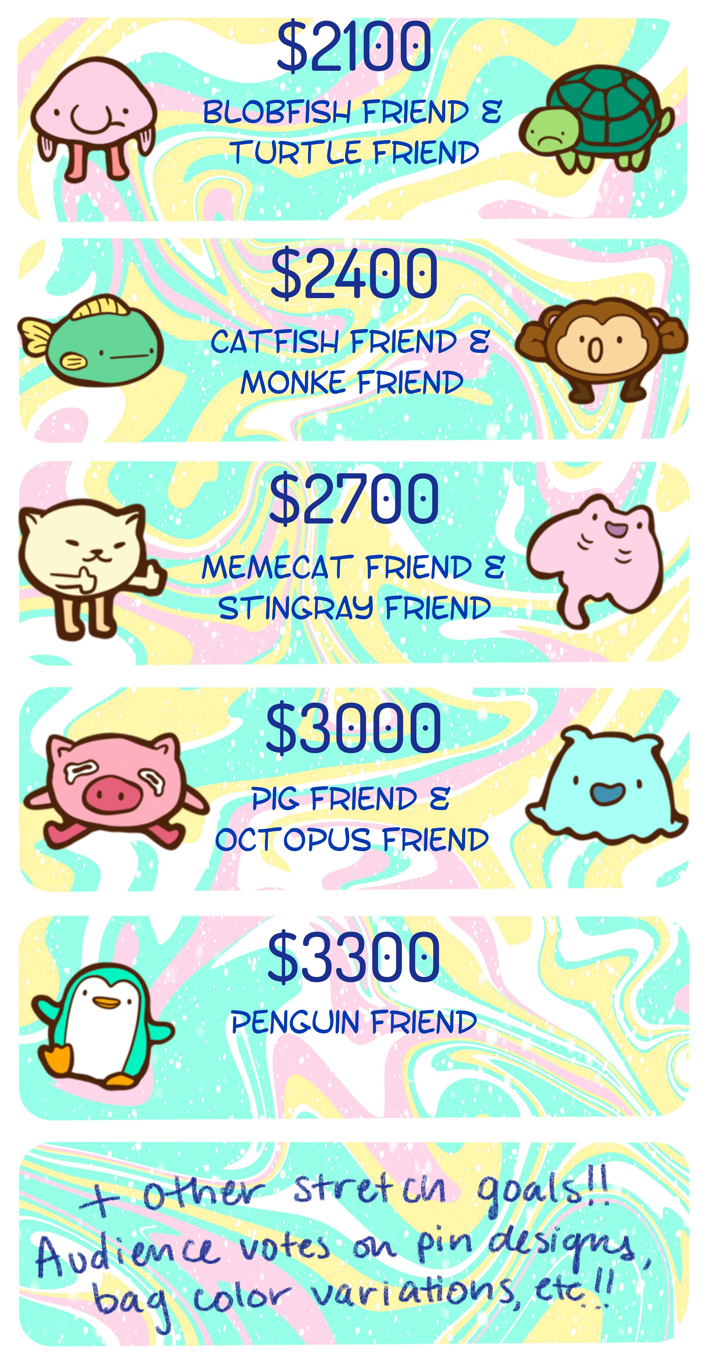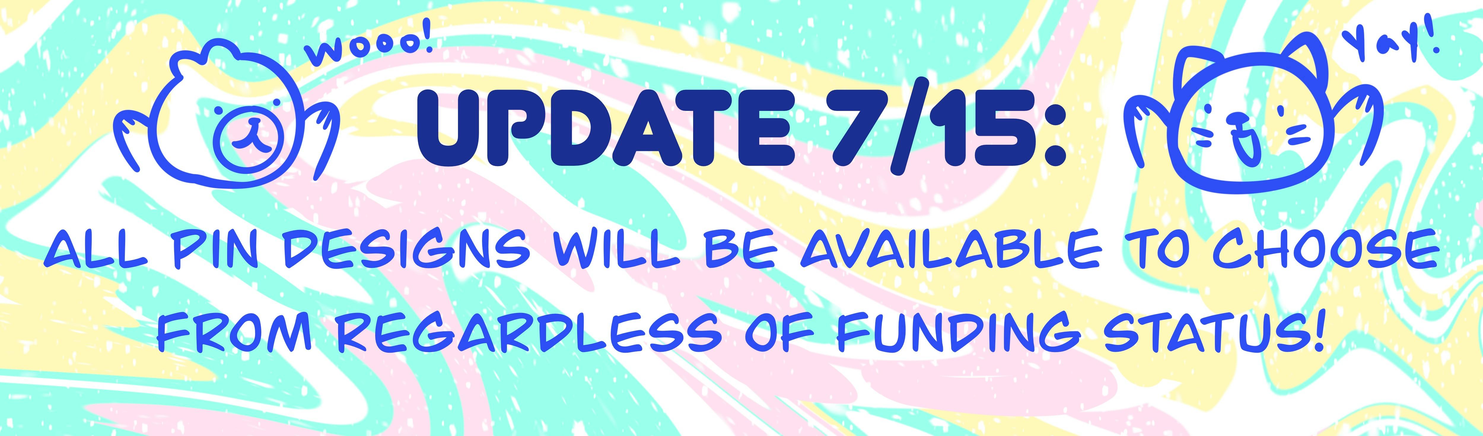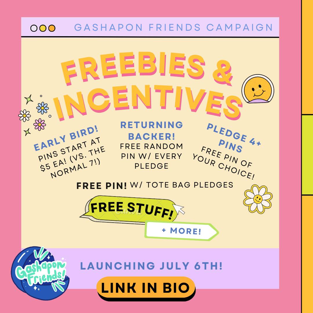 Early Bird Backers - Pins are $1-2 cheaper than normal tiers! Returning Backers - ALL receive a free random Gashapon Friend Pin with any pledge tier! Backers who pledge for 4+ pins - Receive a free Gashapon Friend Pin of their choice! Mini Tote Backers - Every Mini Tote pledge gets a free Gashapon Friend Pin of their choice!