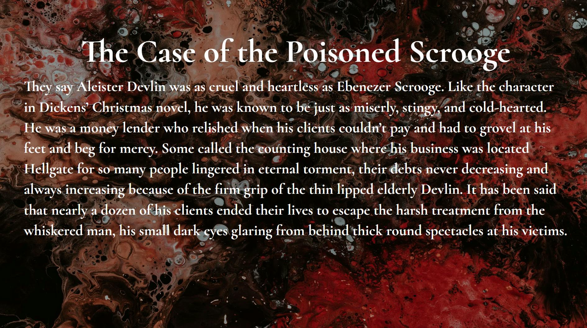 The Case of the Poisoned Scrooge - Who murdered Aleister Devlin, the cruel and coldhearted money lender? It will be difficult to determine since all the guests at his dinner party wanted him dead.