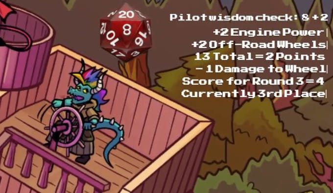 Fog, the wizard wunderkind and their entourage crew a carousel retrofitted with a magical crystal that propels them. The Carousel has nearly non-existent stats, but the wizards can burn spell slots to cast temporary shields, gain bursts of speed, or lob fireballs at their rivals. Be careful, though; they also have to spend spell slots for fuel!