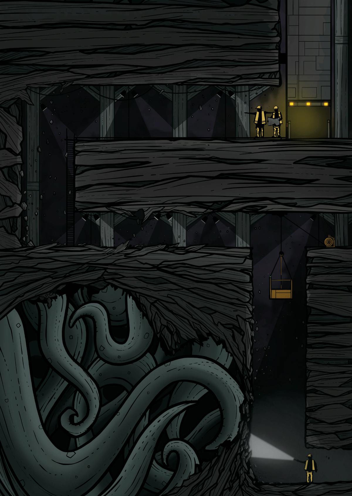 We wanted Paul on the project because we love the way his illustrations make the characters seem small and lost amongst a beautiful and often sinister landscape. This is a great example: The miners are these tiny figures in the deep tunnels of the mine, and the tentacles are vast and monstrous in comparison. We feel like the mine is about to shake itself to pieces.