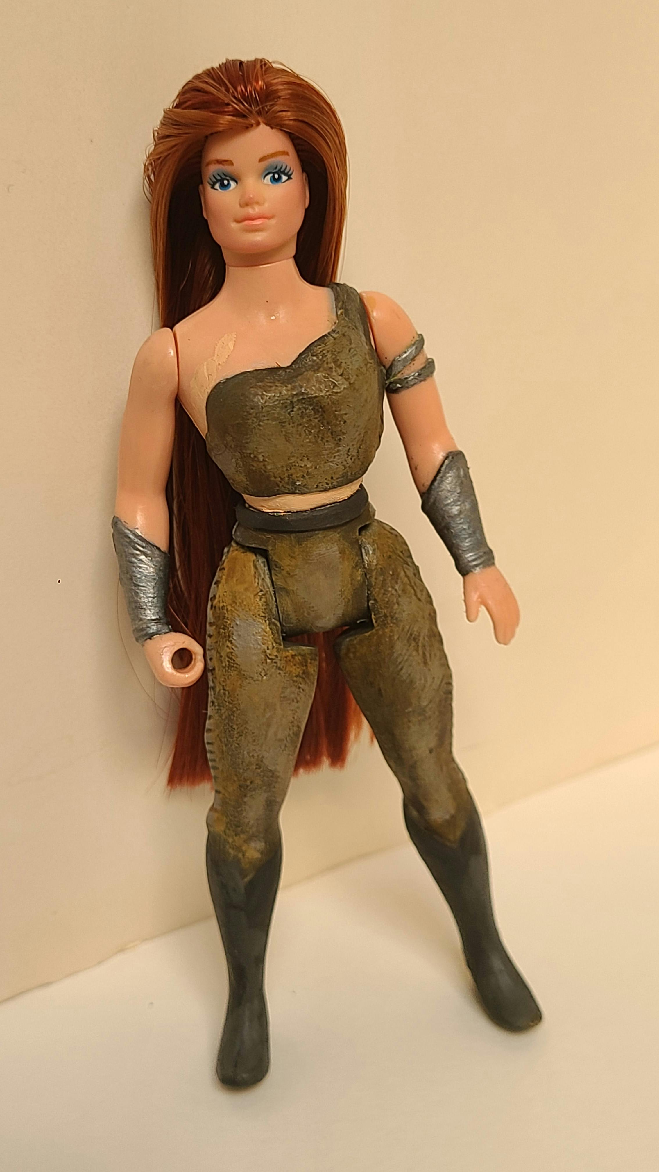 This custom figure was created from a vintage She-Ra figure, with modern nylon hair and epoxy sculpted details painted to match our cover warrioress. She comes in a display box with hand painted backcard.