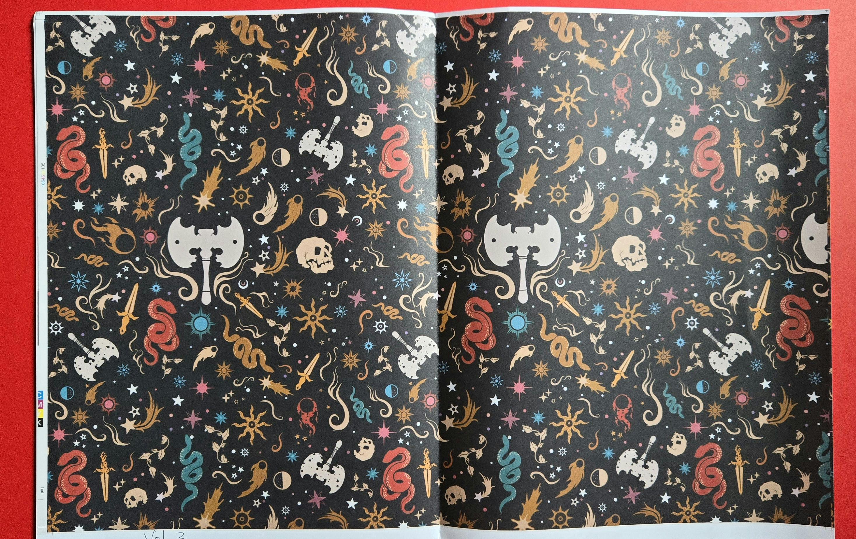 IN DETAIL Ozalid proofs are full prints of each issue that are intentionally done on very cheap paper, and left unbound. The point of them is to have a final, physical object you can use to check for typos and make sure the layout is coming out the way it should. Even in this format, it sure is fun to see the endsheets as a physical object! We've also received ribbon samples to choose from for the hardcover edition's bookmarks. ...and glossy, quality loose covers to check how the colors have reproduced (much better than this quick phone pic suggests!). And one interior art page we were unsure about... Luckily it reproduced just fine! Here's an extremely tight crop/zoom. Who this person? You'll find out when you get issue #4 of NESS. But first I gotta pour a giant mug of tea and get to proofreading these Ozalids...