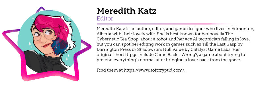 “The stories are sweet, sad, and sexy as hell. Playing feels like falling in love. I have only played one game so far, but it left a profound impression on me. It’s one of those games that proves how beautiful roleplaying is as an art form. Also, there is kissing.” – James D’Amato, The ONE SHOT Podcast Network