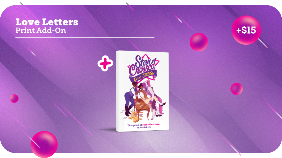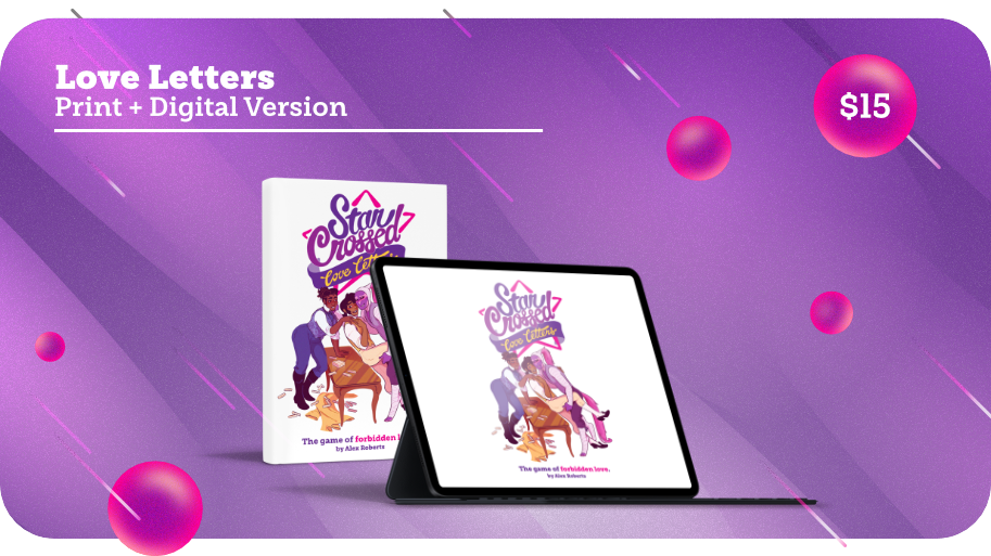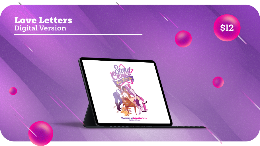 Love Letters is a supplement for Star Crossed, full of beautiful illustrations, pre-generated characters, settings, advice, and alternate modes of play to help your Star Crossed sessions feel fresh and exciting!Â