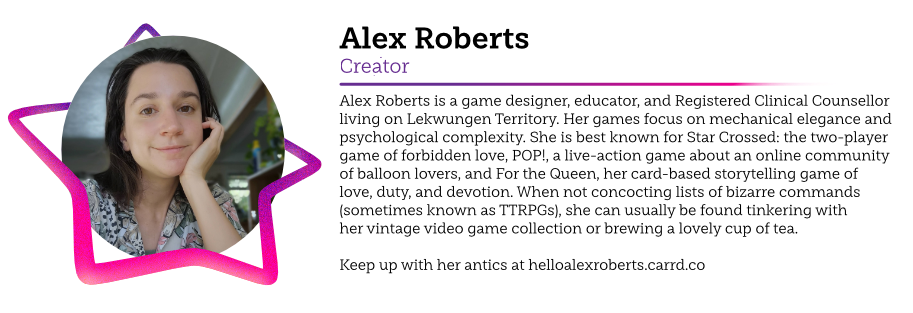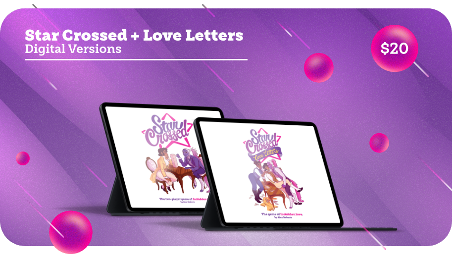Have you been wanting to play Star Crossed?The game is more approachable than ever with rules for playing online, with a twenty-sided die instead of a tower, or with three instead of two players! There’s even a one-player version, because, as one playtester noted, “no one can romance you better than yourself.”