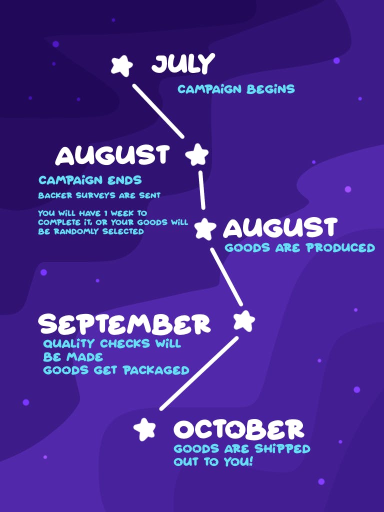 Due to the unpredictability of these processes, the timeline may have slight alterations in both directions in the future in order to insure that each backer gets the best quality product possible. We will send regular progress updates and will have a backer-only discord server for more regular updates.
