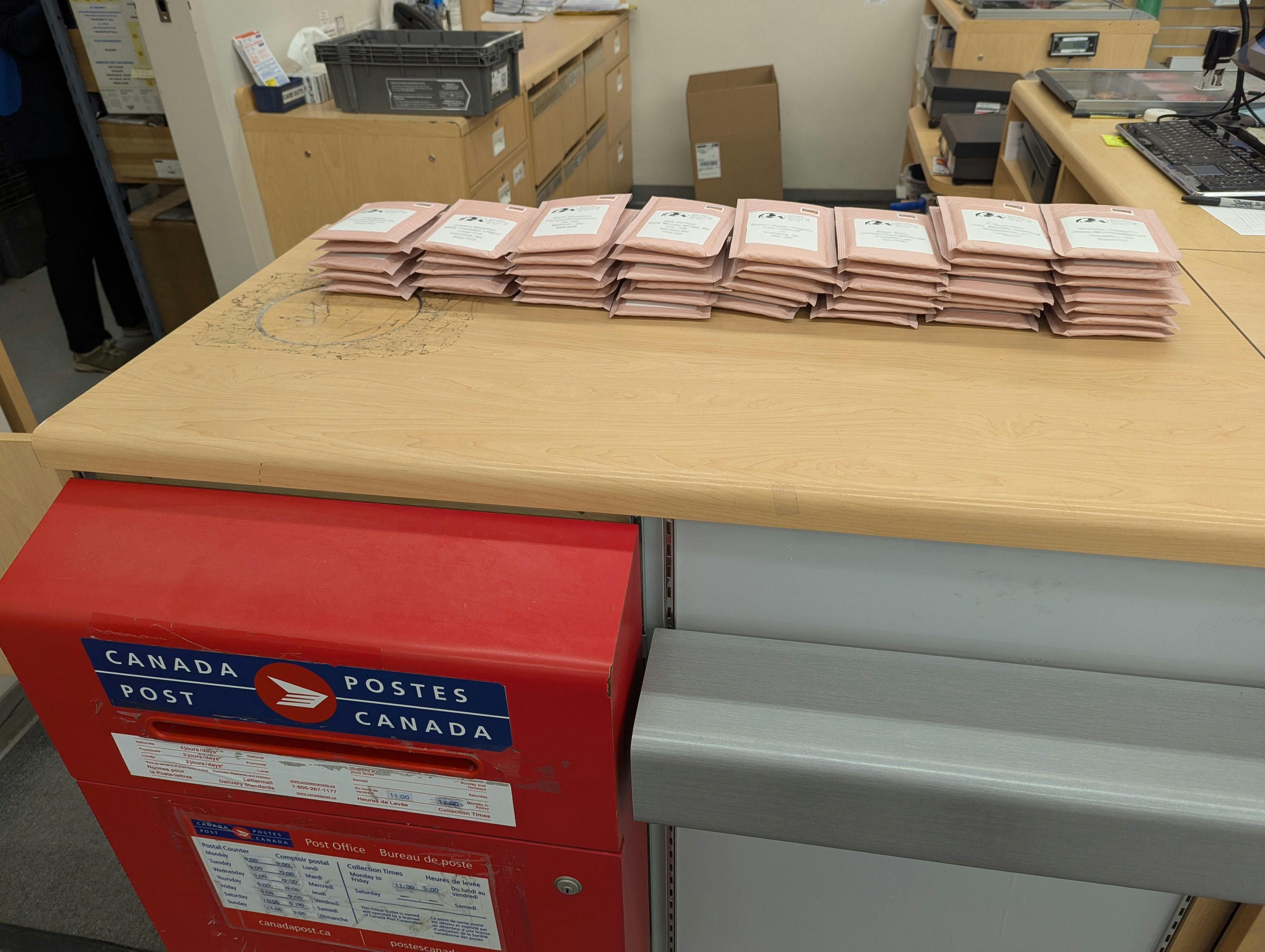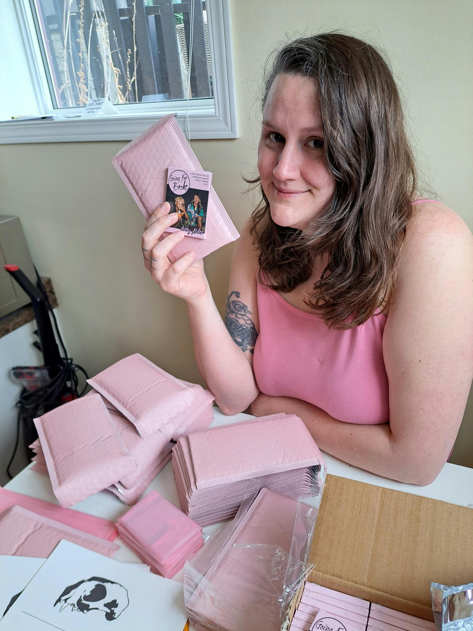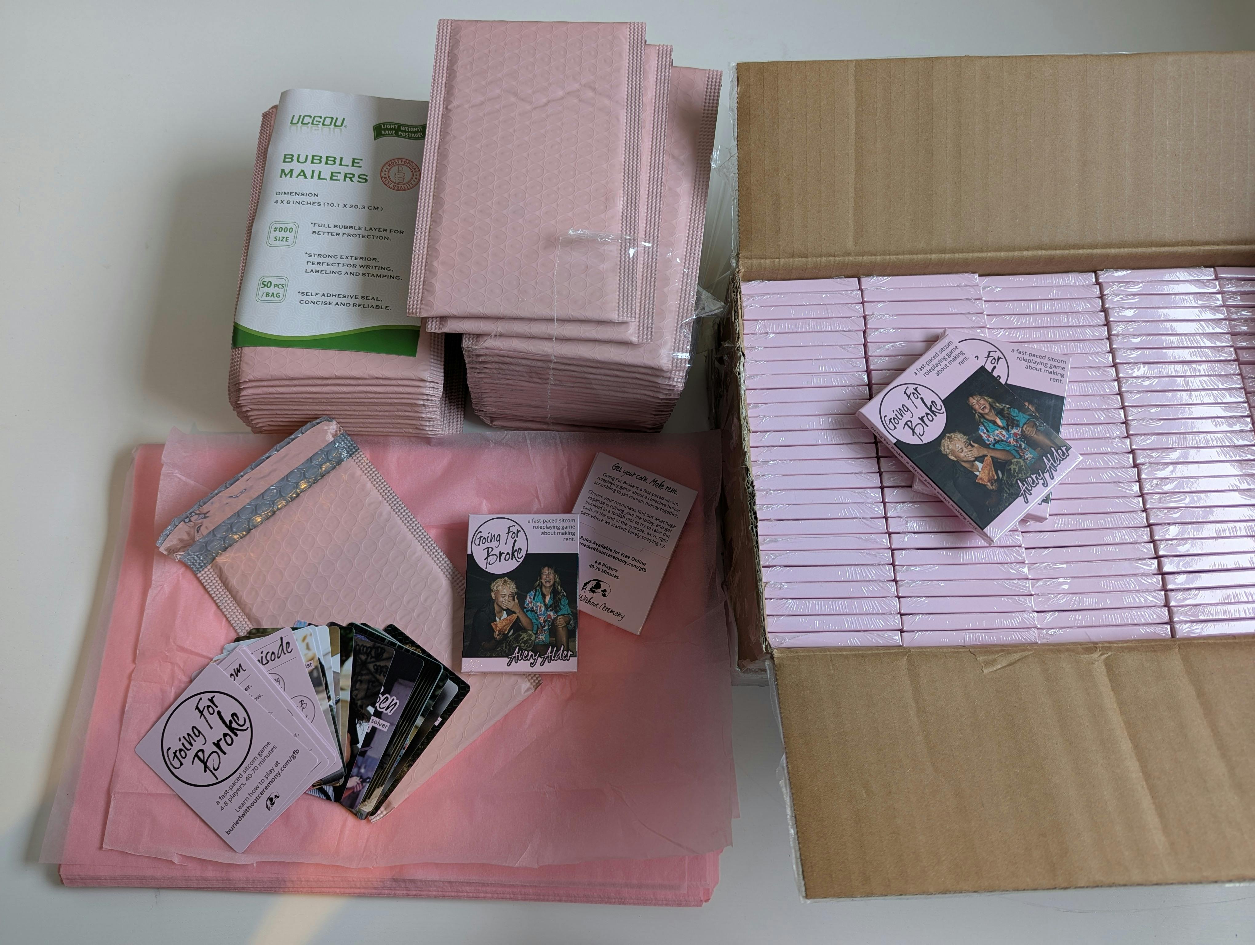 And for a cute way to end this update, here are a few progress shots of my shipping process. This all-pink packaging is used for any orders that I send from here in Canada that are for just a single copy of Going For Broke.