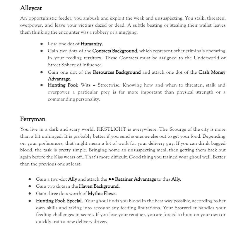 And a sneak peak of Predator Types from the book. Predator Types are our lead developer’s favorite part of V5. Were you V5 fans wondering where the free discipline is that’s usually associated with Predator Types? In place of that, we give a free extra discipline dot during character creation. Our intent was for players to choose a Predator Type that suited their character, not to optimize the discipline it came with. Here’s two from the upcoming book:
