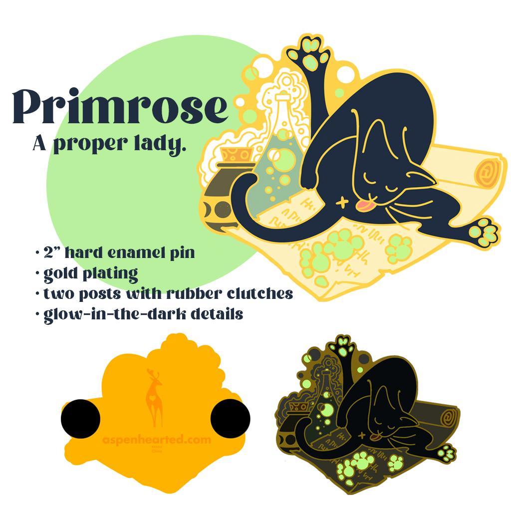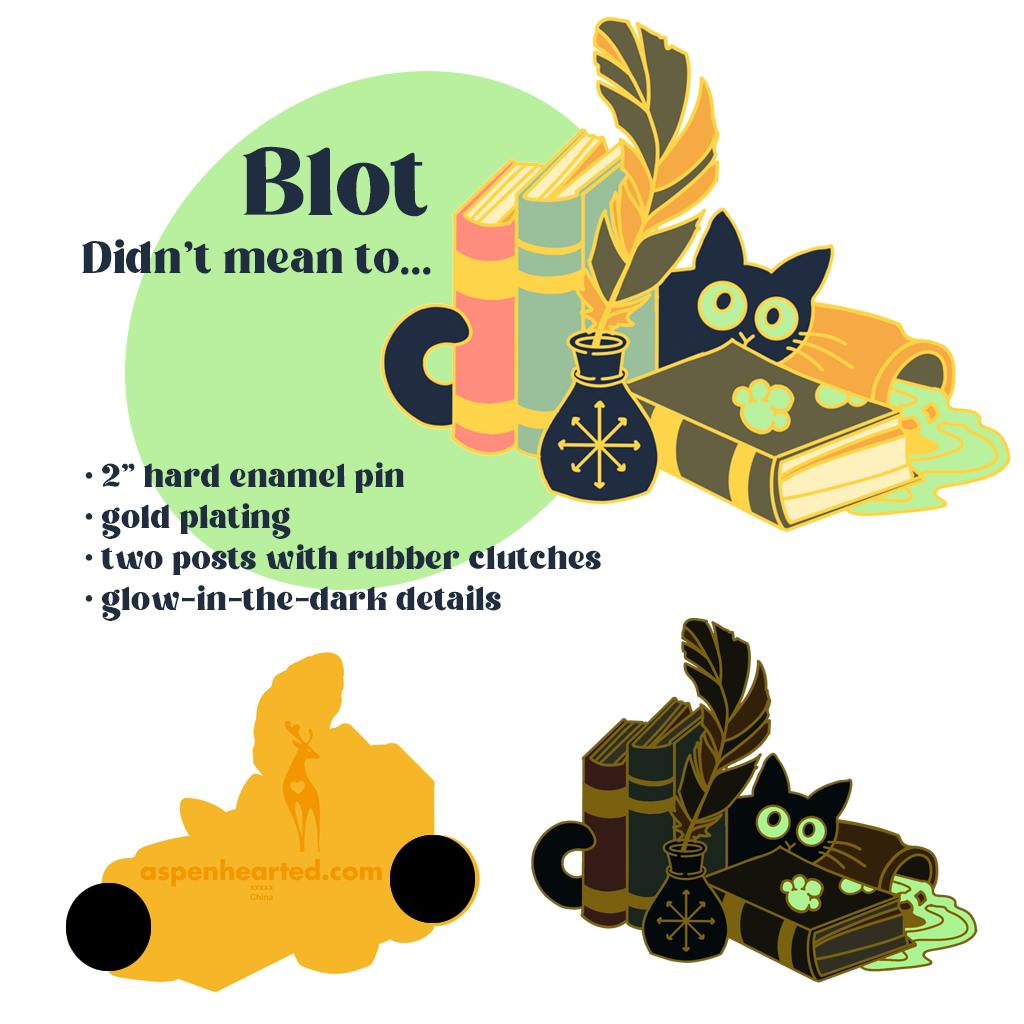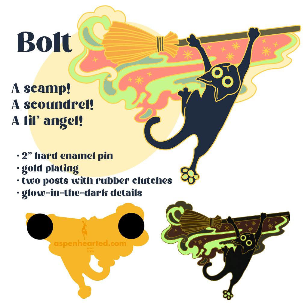 These cats spell trouble! Frantic Familiars Bolt, Blot, and Primrose are ready to keep you company and “assist” in hexes and hijinks. These 2” hard enamel pins feature gold plating, glow-in-the-dark details, and two posts with rubber clutches.