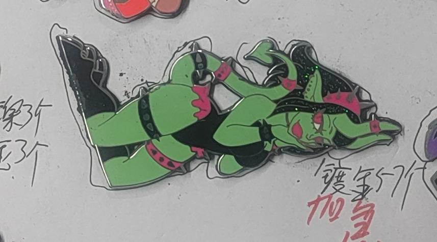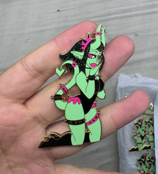 Pin will be roughly 1.75 inches, purple dyed enamel with epoxy topper, glow in the dark eyes.
