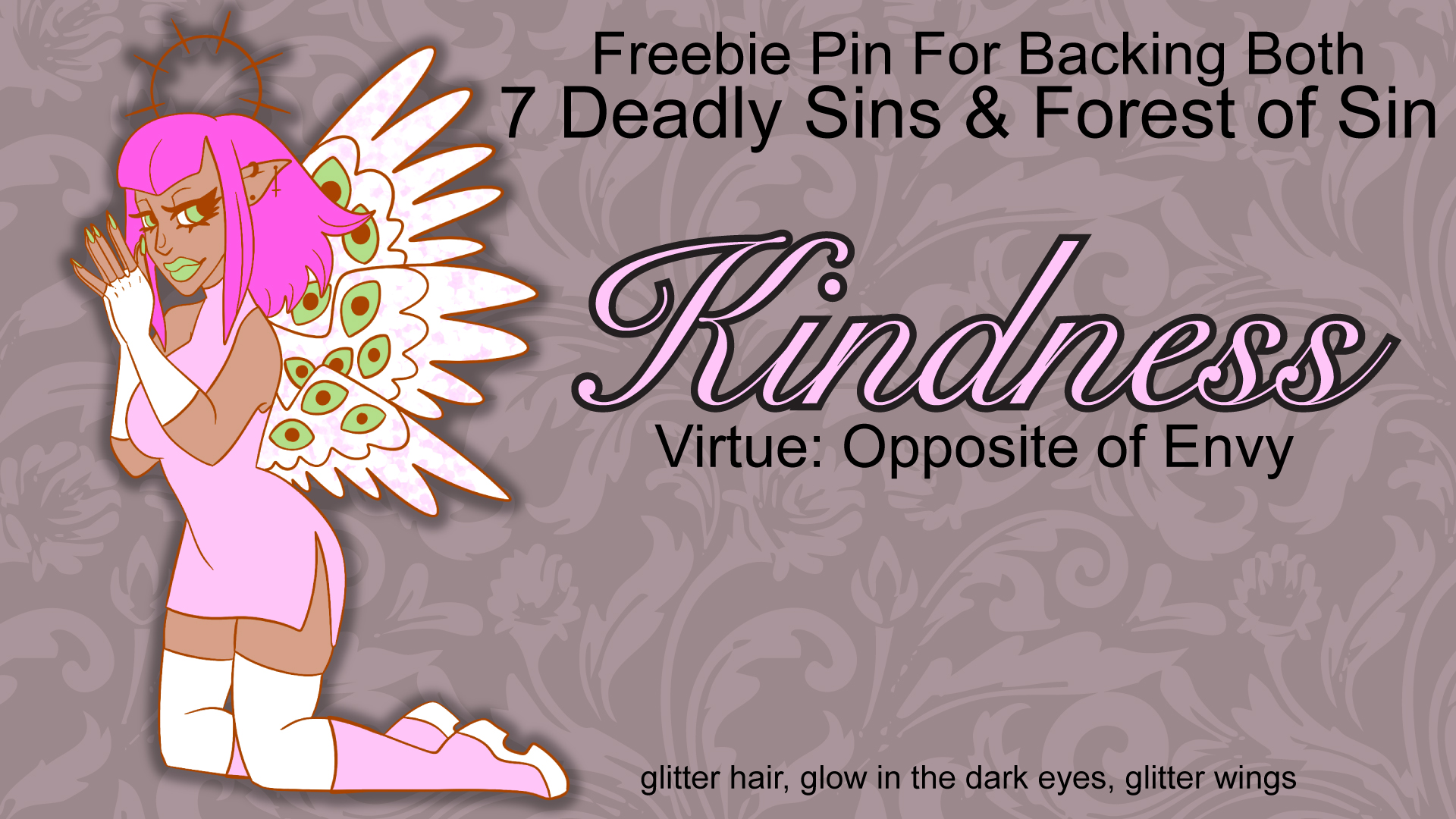 Hello everyone! I'm trying something different for this campaign by allowing for the backers and future backers to vote for the unlock order of the Sins! There are Seven to choose from, I'm also attaching the Freebie Design. Here name is Kindness and She's a Virtue! She's Envy's sister. Kindness will unlock at the main goal as the freebie no matter who is chosen as the first goal!