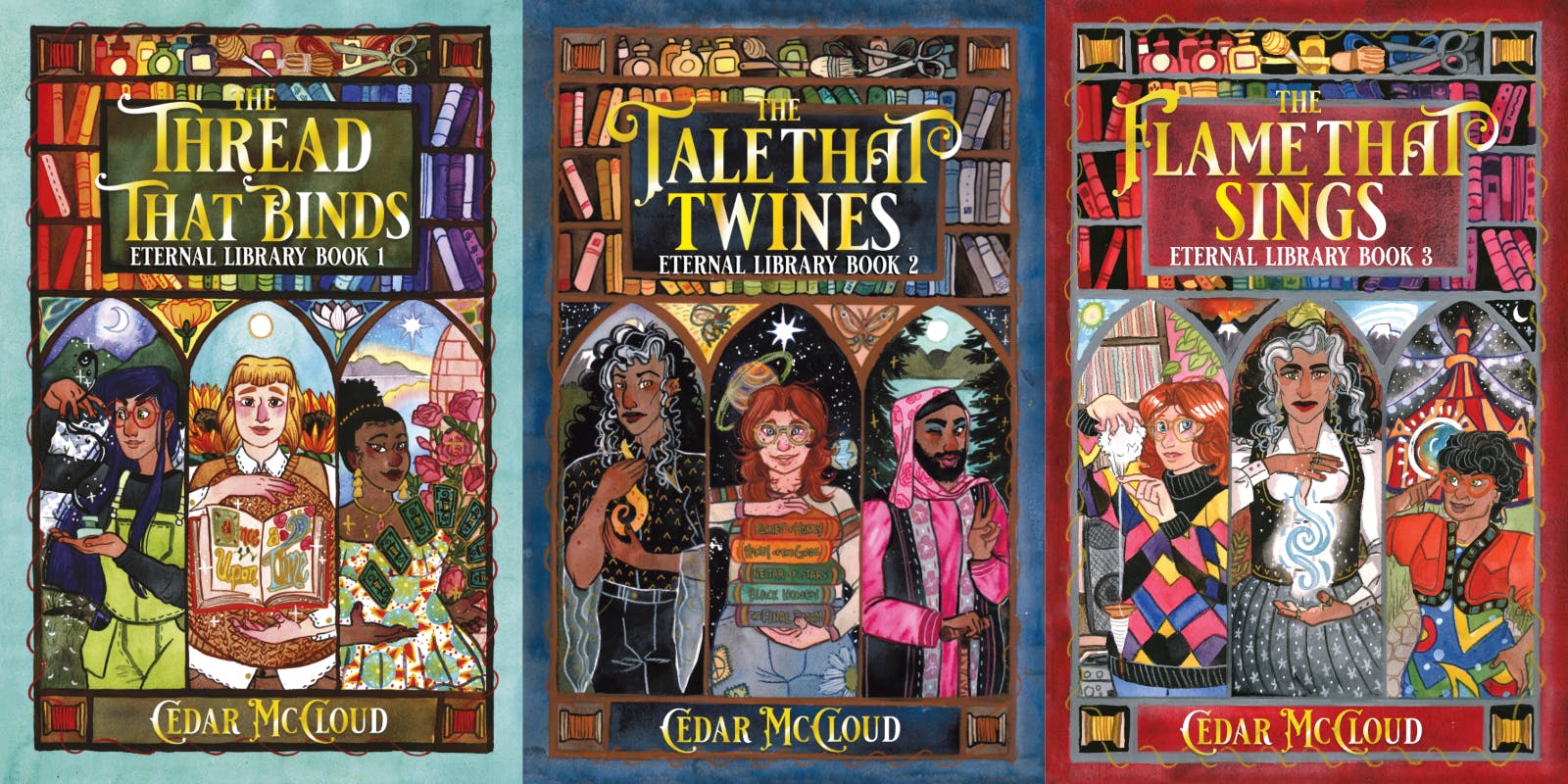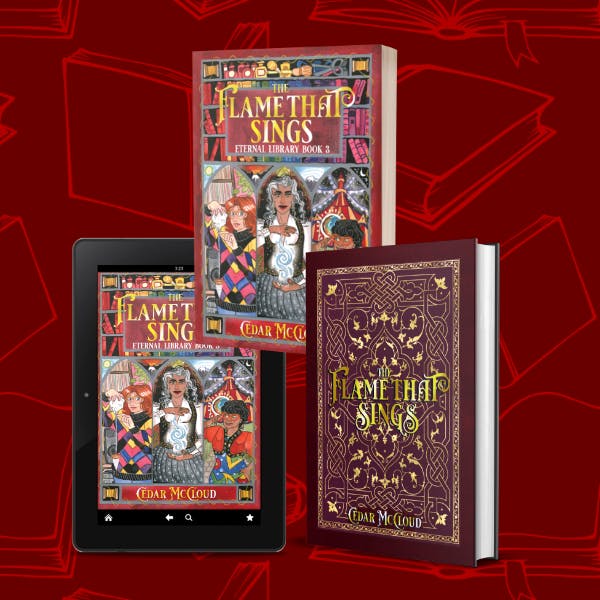 THE FLAME THAT SINGS is the third book in the Eternal Library Series, an adult fantasy quintet about an intergenerational found family of magic bookbinders. This series features an all queer, mostly neurodivergent cast of lovable characters as they learn their craft, heal from trauma, and protect the Library from falling into the wrong hands.