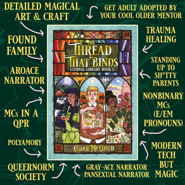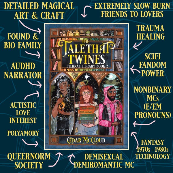 The next book in the Eternal Library Series, an adult fantasy quintet about an intergenerational found family of magic bookbinders. Featuring an all queer, mostly neurodivergent cast of lovable characters using storytelling and art to heal from trauma.