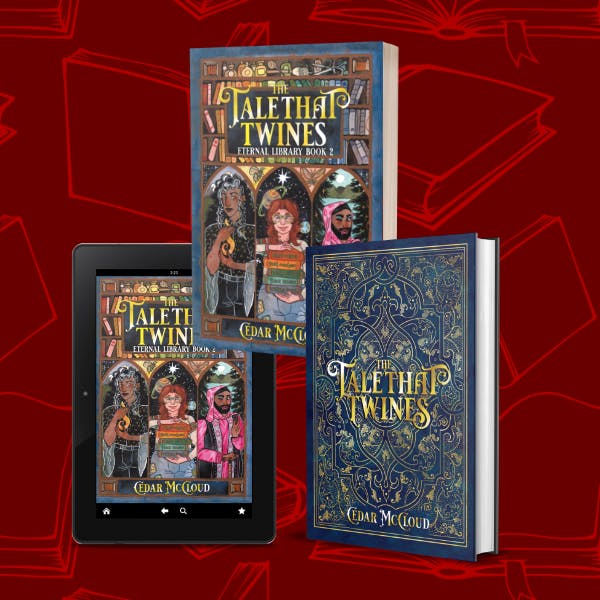 Already caught up on the series? Grab an ebook, paperback, and/or exclusive hardcover copy of this next book! First time hearing about it? Grab all three books in the series so far and enjoy your new mini-library of deeply emotional but comforting, sometimes cozy queer and neurodivergent fantasy.