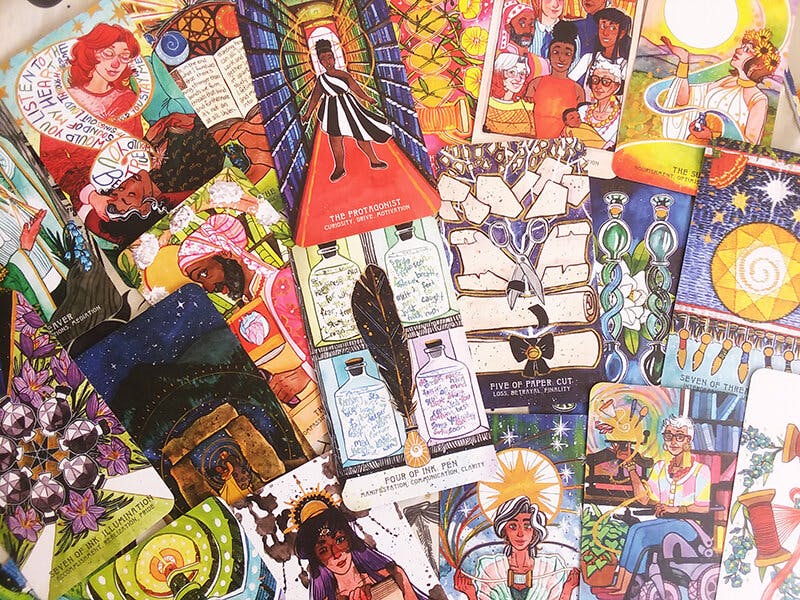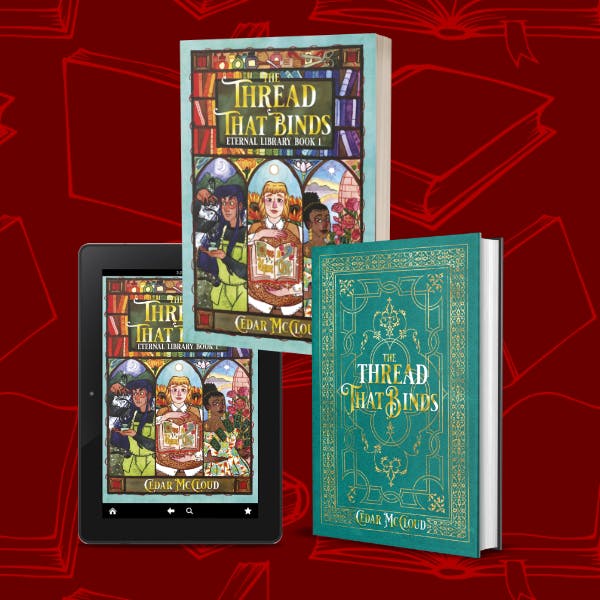 The Threadbound Oracle A 50-card oracle deck I designed specifically for the world of the Eternal Library. One of the main characters uses this deck in The Thread That Binds (Book 1) to do readings! The real life version contains illustrations of the characters themselves in very metatextual ways. Comes with a guidebook in a cute book-shaped box with a magnetic closure. Great for personal psychological exploration or storytelling prompts.
