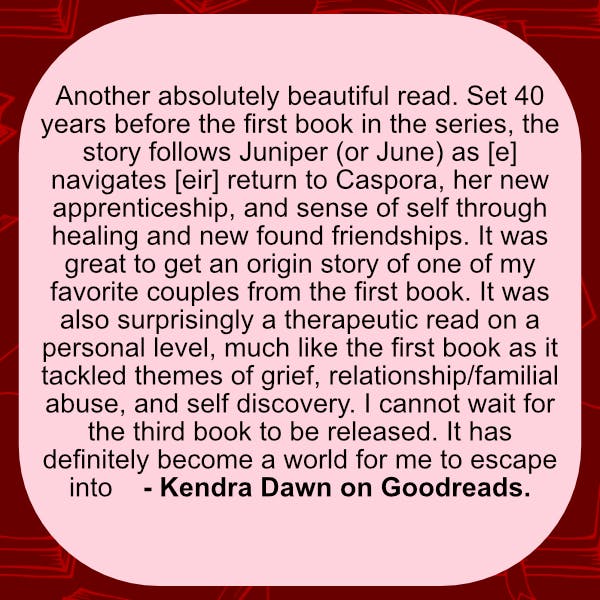 All we have is now. Forty years before The Thread That Binds, Juniper Starstitch returns to Caspora City young and hopeful. Chosen to be Head Librarian Opaline Sweetfrond's last apprentice, June arrives at the Eternal Library looking to discover the magical manuscript art of Illumination—and to recover the memories lost to the trauma of the massive earthquake that killed one of eir parents a decade earlier.
