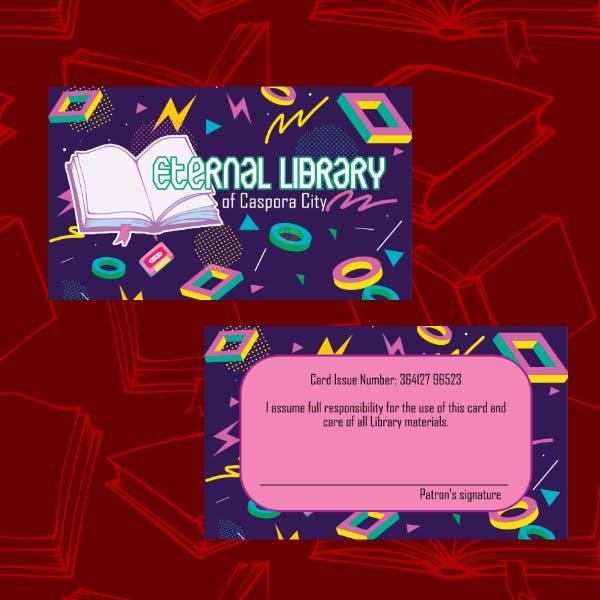 Library Card Bookmark A laminated library card for the in-book Eternal Library of Caspora City, which you can use as a bookmark! I imagine the characters carry the same one in their wallet...