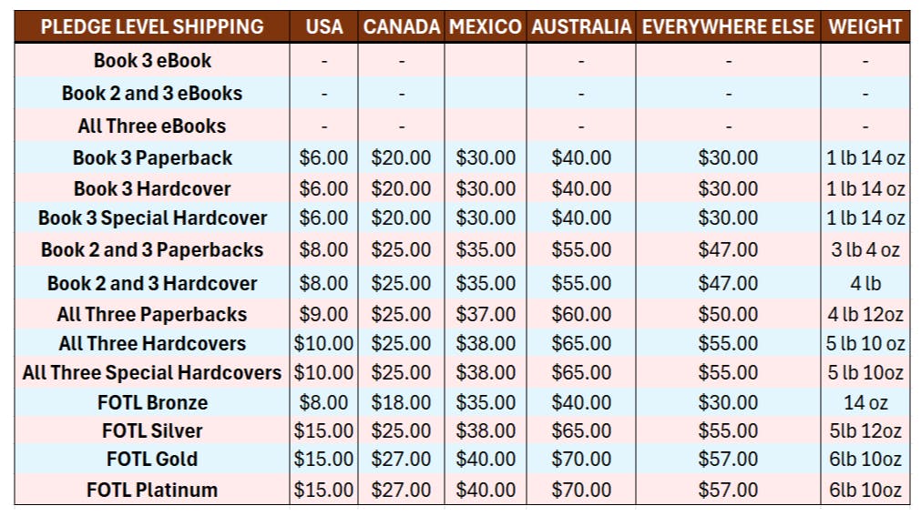 June 2 to July 2, 2025 - Crowdfunding campaign Summer 2025 - Book 3 Line edits Early fall 2025 - Off to my editor! October/November 2025 - Applying final edits and formatting, ordering printed formats November 2025 - Shipping costs charged to backers around this time