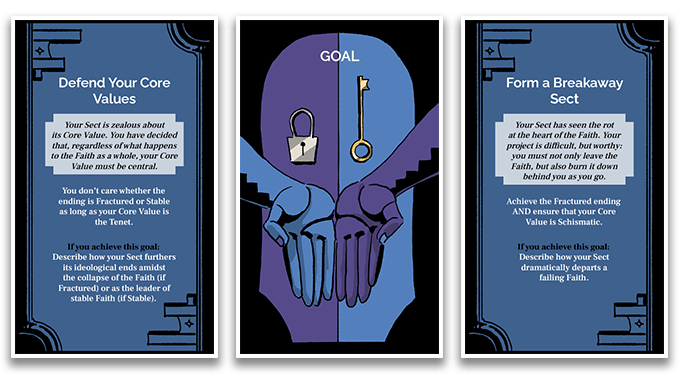 In Keep the Faith, you’ll play aspect cards and narrate short stories to describe how the practices and trappings of your fictional Faith express different (and at times contradictory) beliefs. What does your religious music sound like if it’s demonstrating your commitment to welcoming the outsider, as opposed to your desire to wield power? What does your altar look like if it's an altar for keeping secrets as opposed to spreading the word? External pressures and tensions within the Faith will cause your beliefs to shift and might even drive the Faith to fracture and fall into irrelevance.