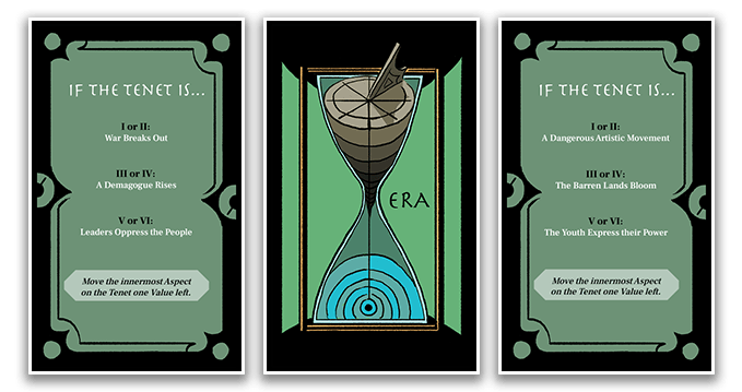 Twelve (12) Era cards, which describe social forces acting on the Faith and give storytelling prompts to help move the narrative from one Era to another.
