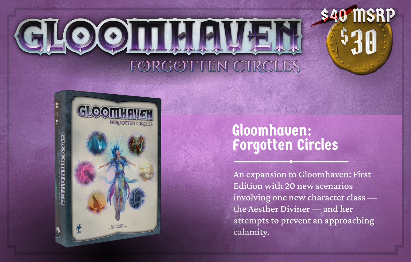 For those not aware, Forgotten Circles is an expansion to the first edition of Gloomhaven, and we have no plans for updating it. That said, it is more-or-less combatable with the second edition of Gloomhaven as well, with a little wonkiness (for full details on that wonkiness, you can read this BGG thread). It is out of print currently, so we decided this is as good a time as any to spin up another print run. This will be the same version that was available during the Frosthaven Kickstarter, with a handful of typo fixes.
