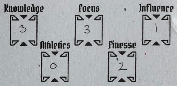 Next, though, let's talk about attribute scores. There are five attributes in the game: