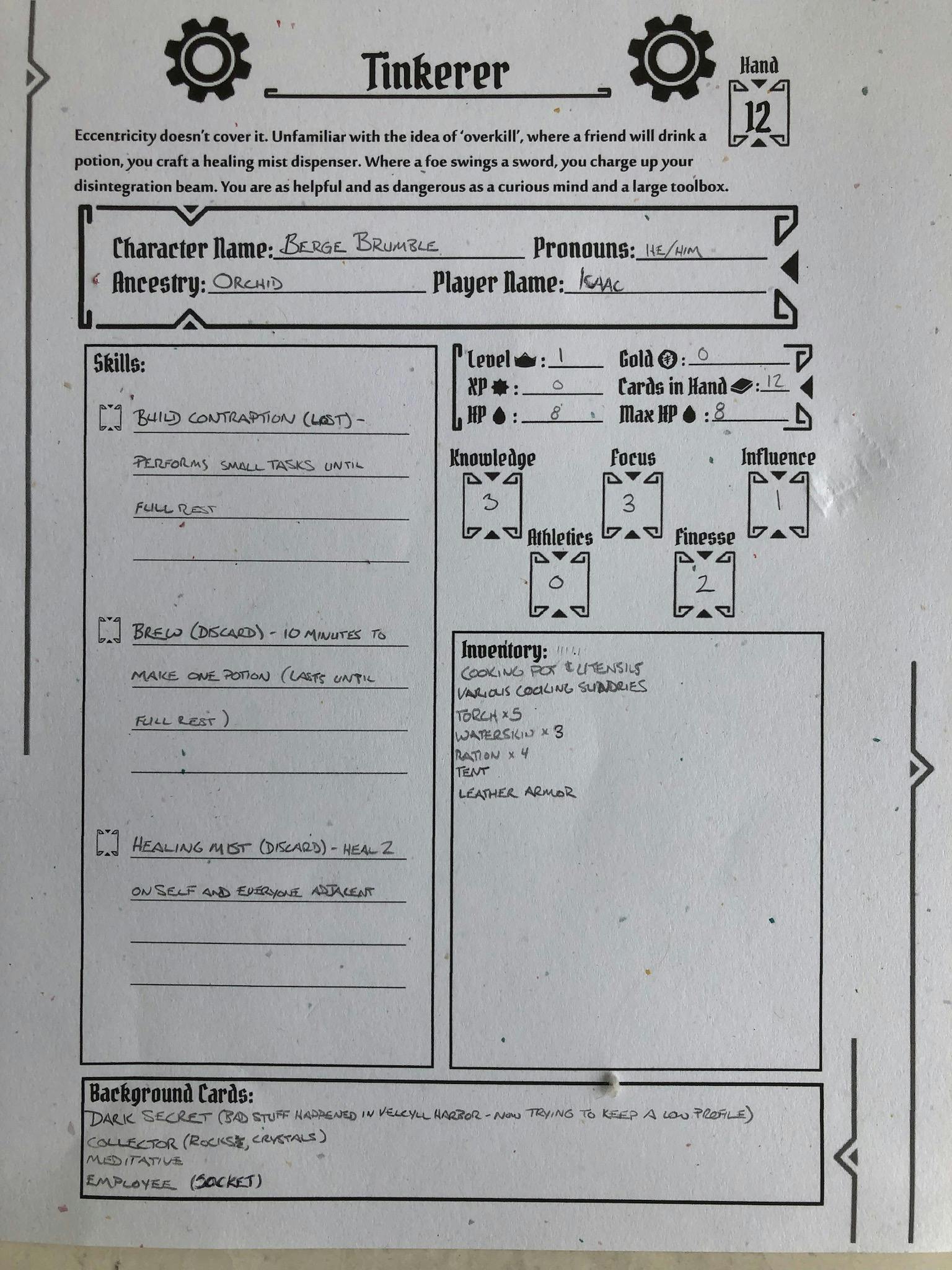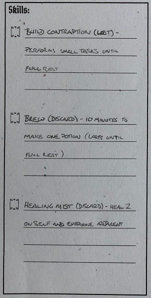 So the thing about Berge is that he is an excellent manservant. He lives to serve others, so his skill choices are going to reflect that, as skills are mostly used in role playing out of combat (though skills and attribute checks can be used in combat as well, in lieu of an ability card action). Characters get three skills at level 1, so Berge will take Build Contraption (to provide extra help in performing his duties), Brew (Berge makes a mean cup of tea), and Healing Mist (for when his employer finds themselves hurt).