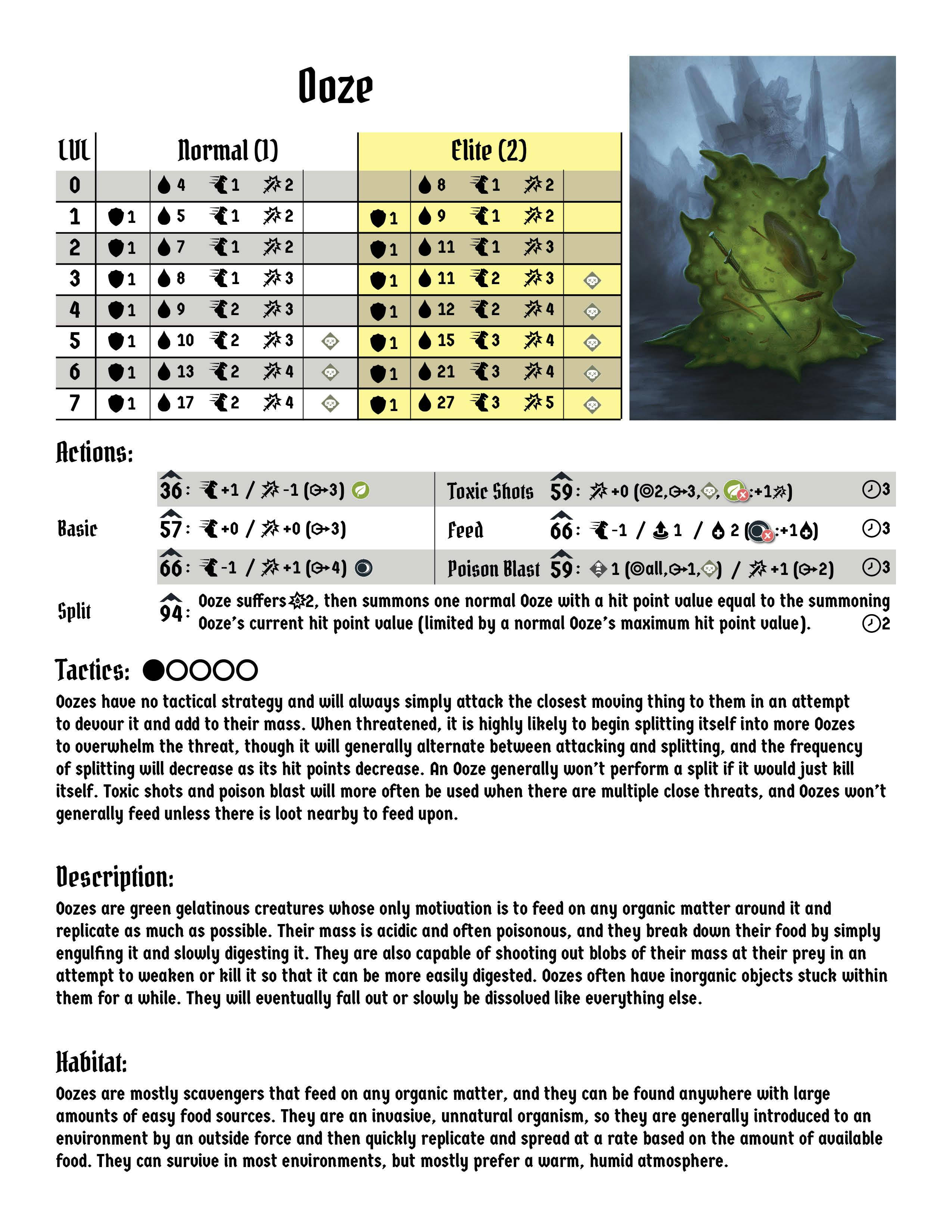 The top half of the page is information that should look familiar: stat blocks for normal and elites at all levels and a list of potential actions (with initiatives) that are essentially analogous to the ooze ability card deck. This is so that if you own a copy of Gloomhaven, you can use the monster components from the box instead of the bestiary, if you find that more convenient (the bestiary will represent the stats of monsters in second edition, but no one is going to stop you from using first edition monsters - or Frosthaven monsters for that matter).